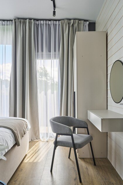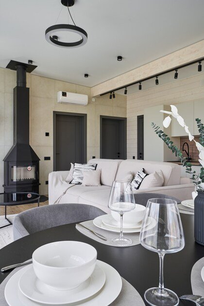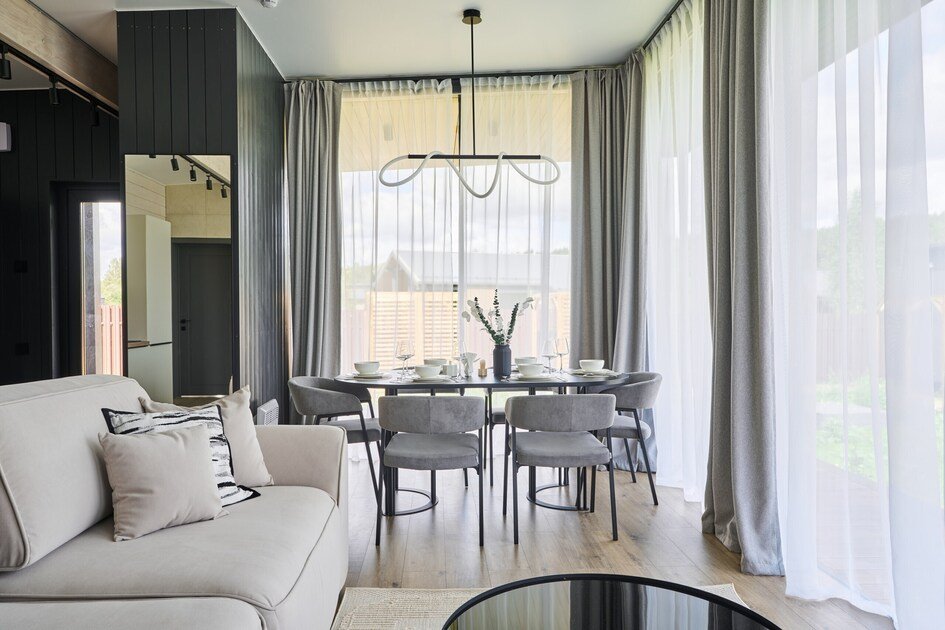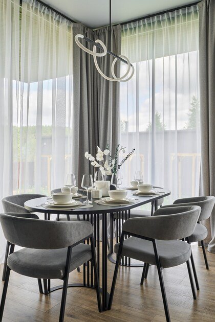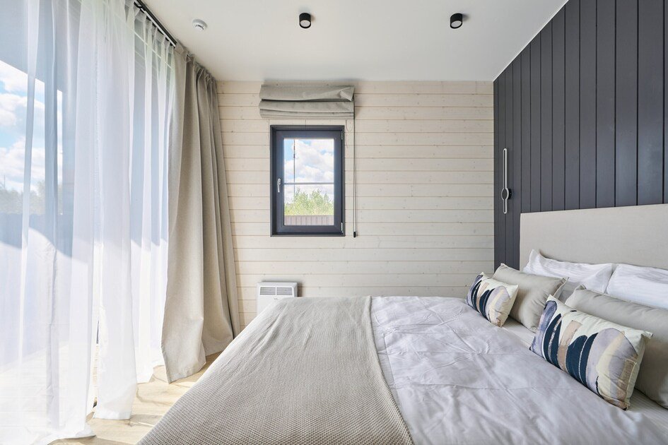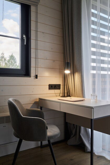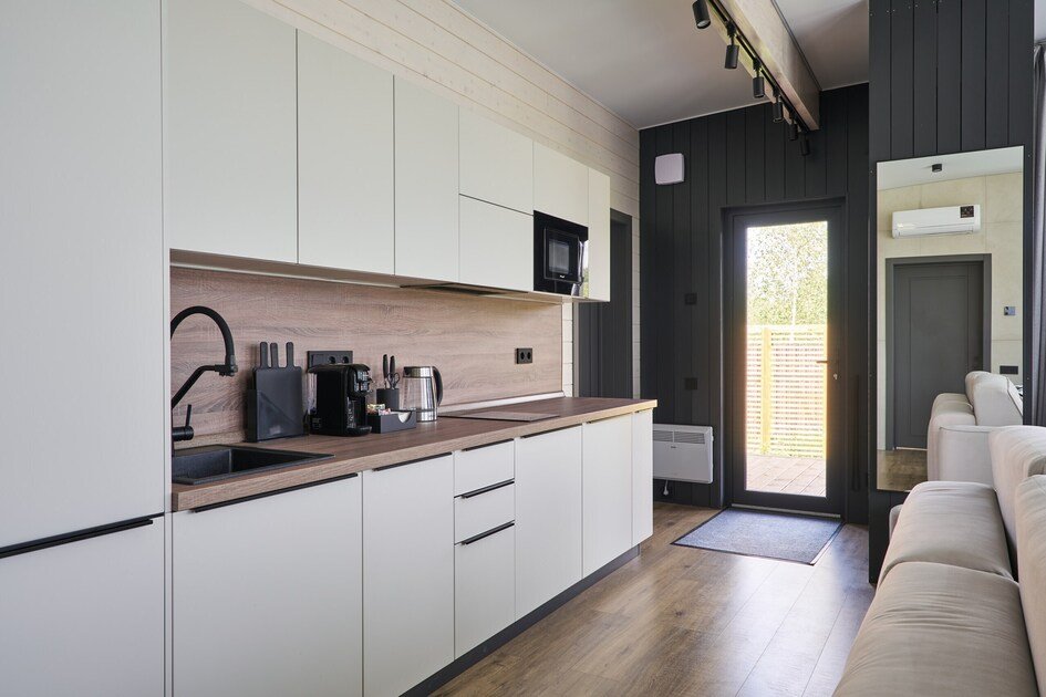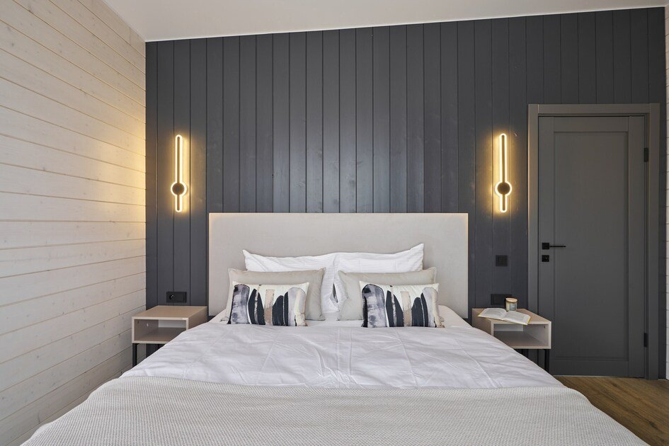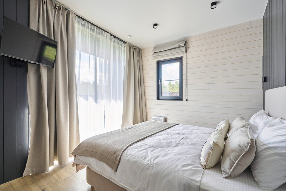 Светлый дом с панорамными окнами и сауной, расположенный рядом с деревней Бекетово. Внутри вас ждут три отдельные спальни с односпальными кроватями, которые можно легко сдвинуть в двуспальные.