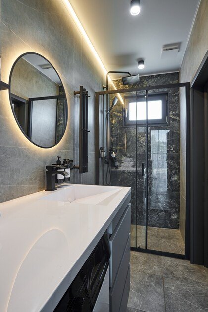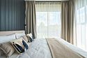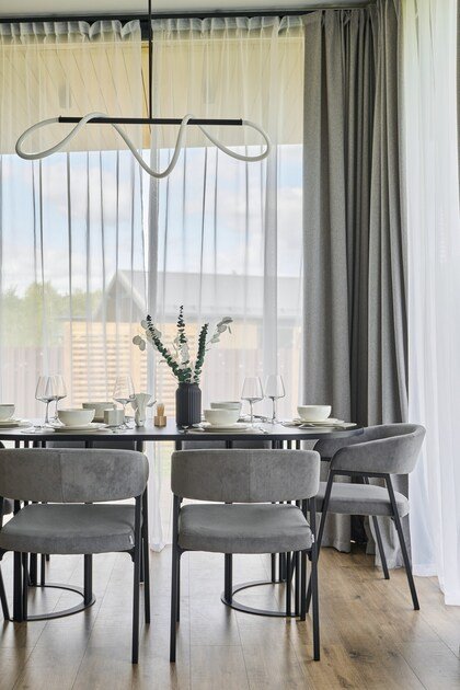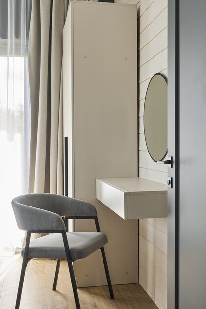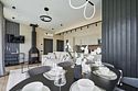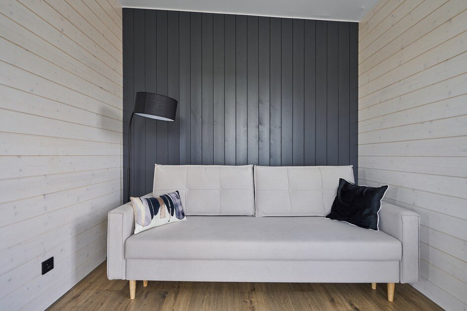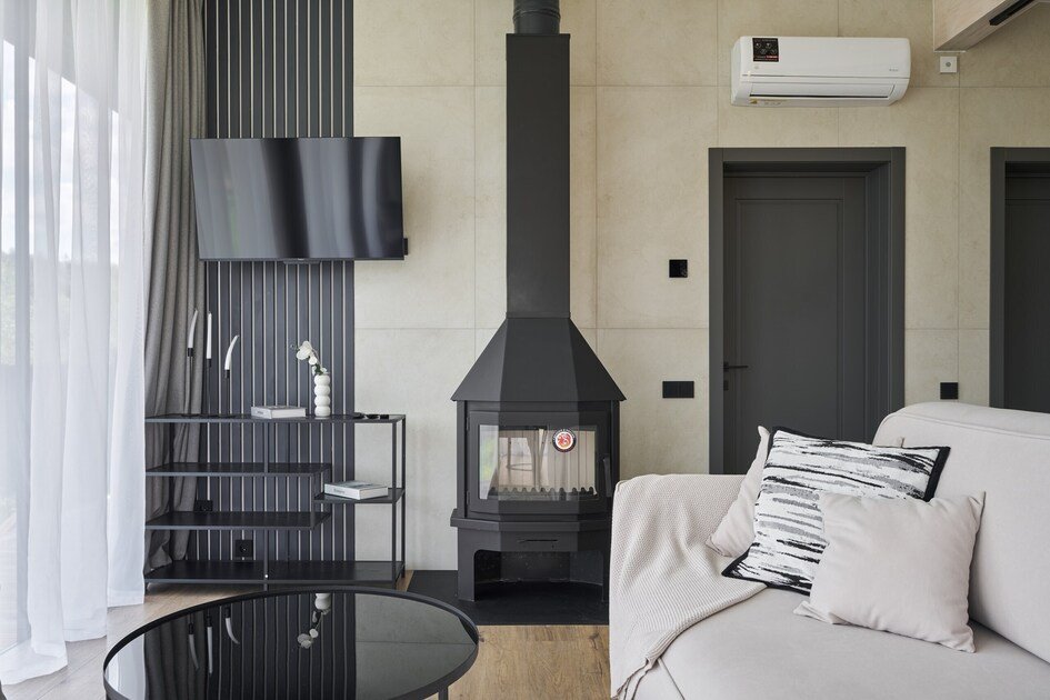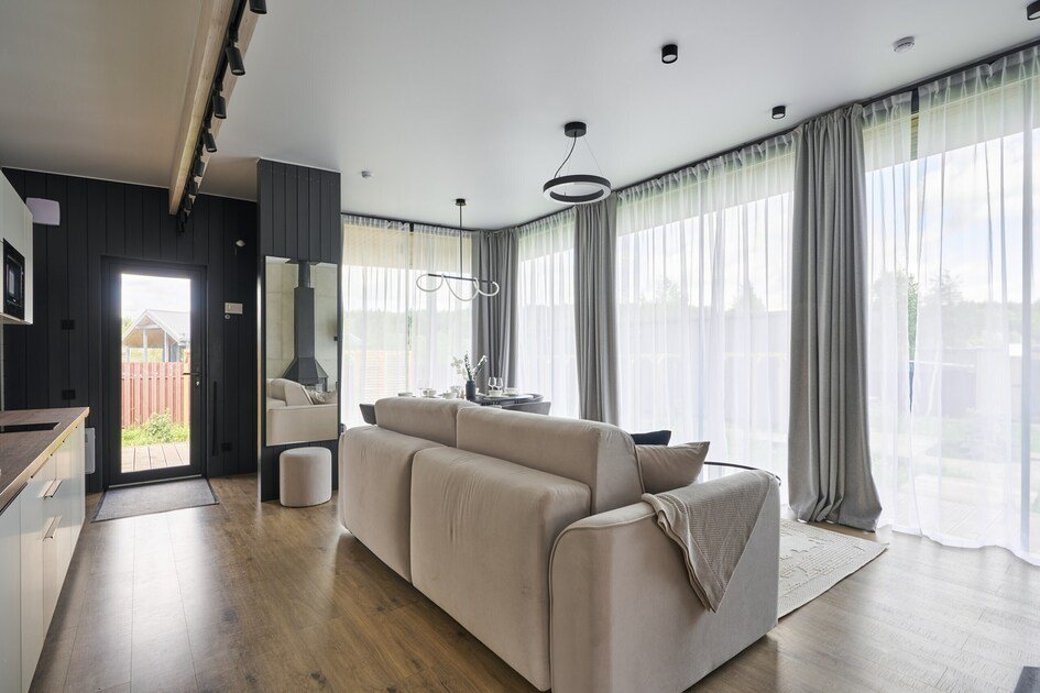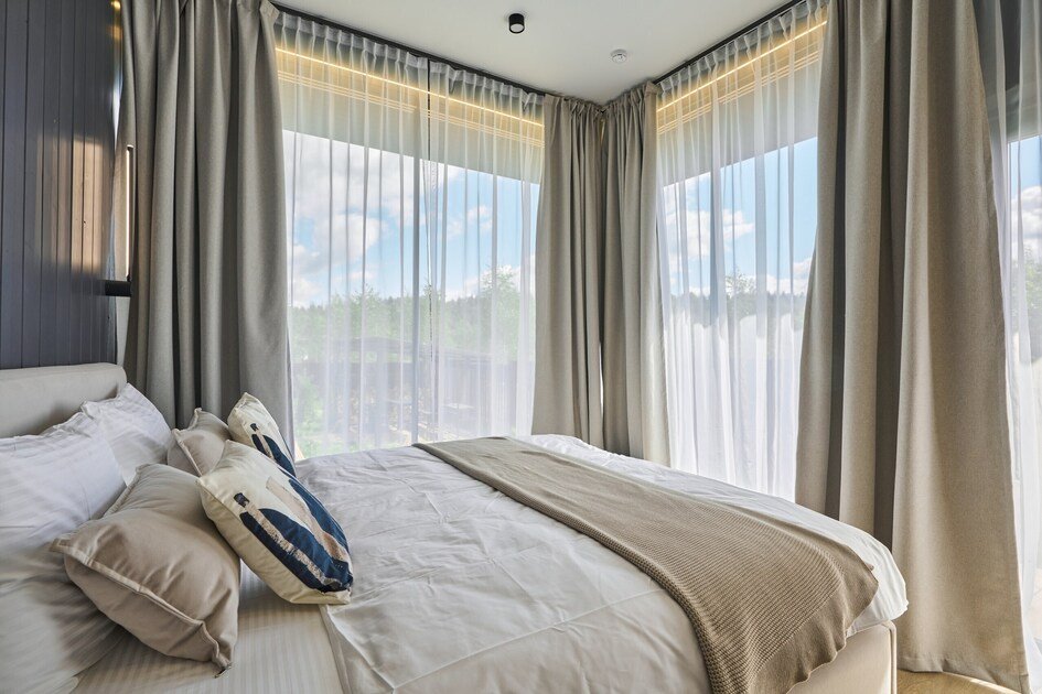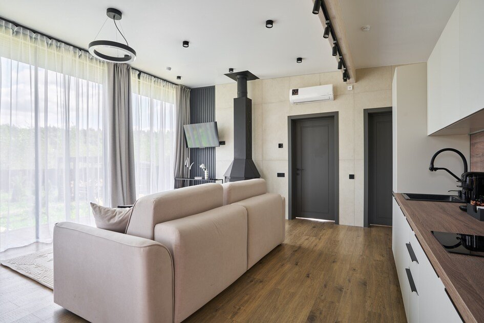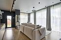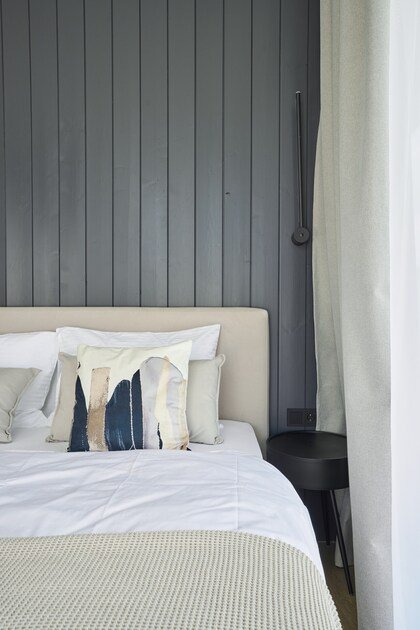 Светлый дом с панорамными окнами и сауной, расположенный рядом с деревней Бекетово. Внутри вас ждут три отдельные спальни с односпальными кроватями, которые можно легко сдвинуть в двуспальные.