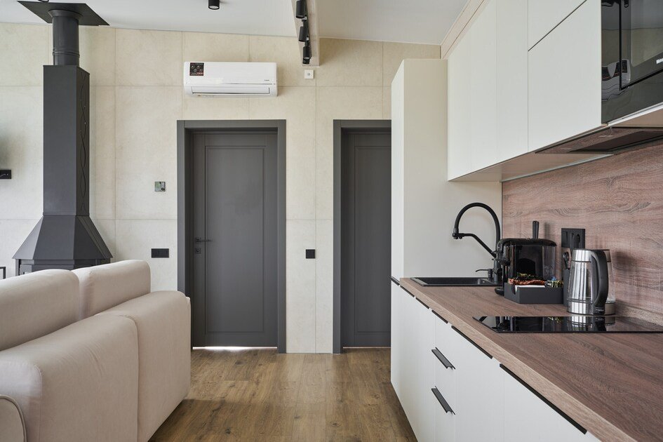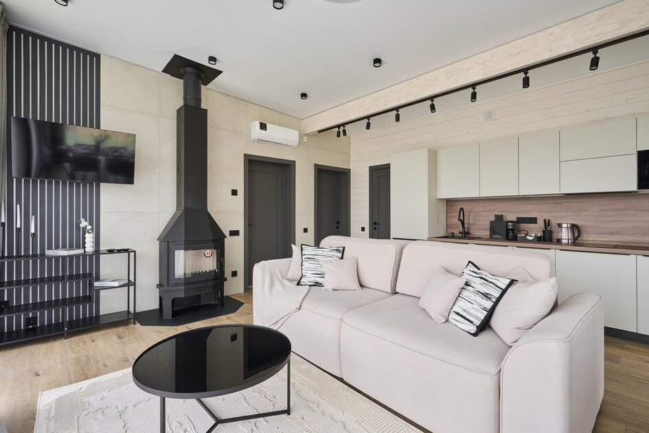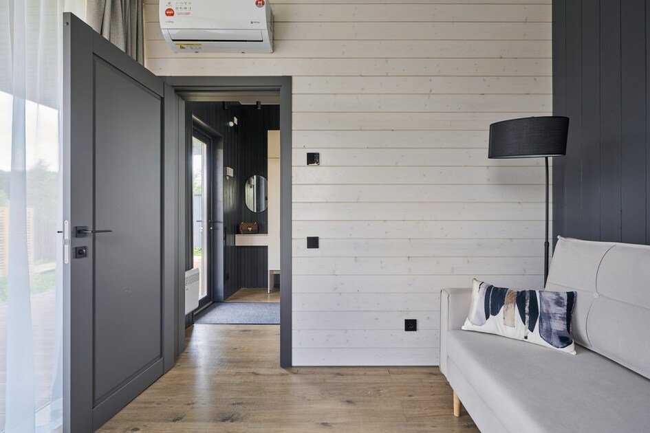 Просторная гостиная с мягкой мебелью, полностью оборудованная кухня, санузел с душевой кабиной и сауна в доме. Для комфорта установлен кондиционер, а также имеется необходимая техника, посуда, текстиль и мыльные принадлежности. На участке есть собственная мангальная зона и парковка.
