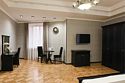 Просторный номер с гостиной, кабинетом, спальней и двумя лоджиями с видом на открытый бассейн и парковую зону.
