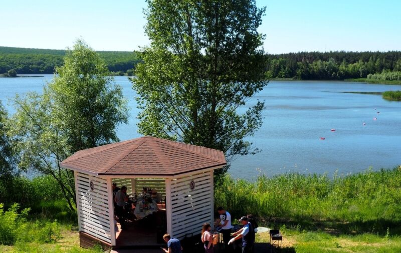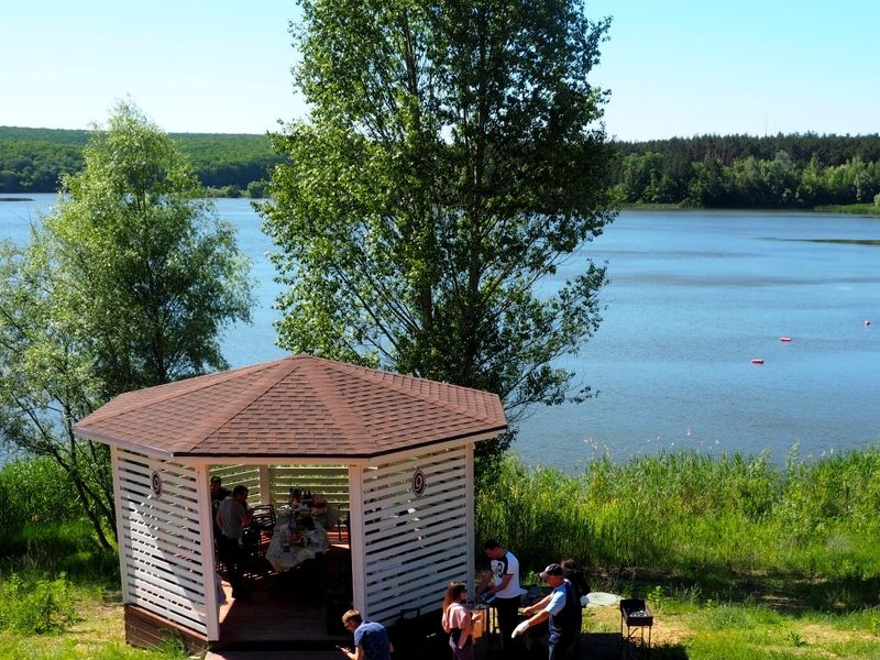 На территории комплекса расположены 14 открытых беседок — десять беседок на берегу, 3 в лесу и просторная банкетная Лесная поляна.Беседки вмещают от 6 до 80 человек и включают все необходимое для комфортного отдыха:
