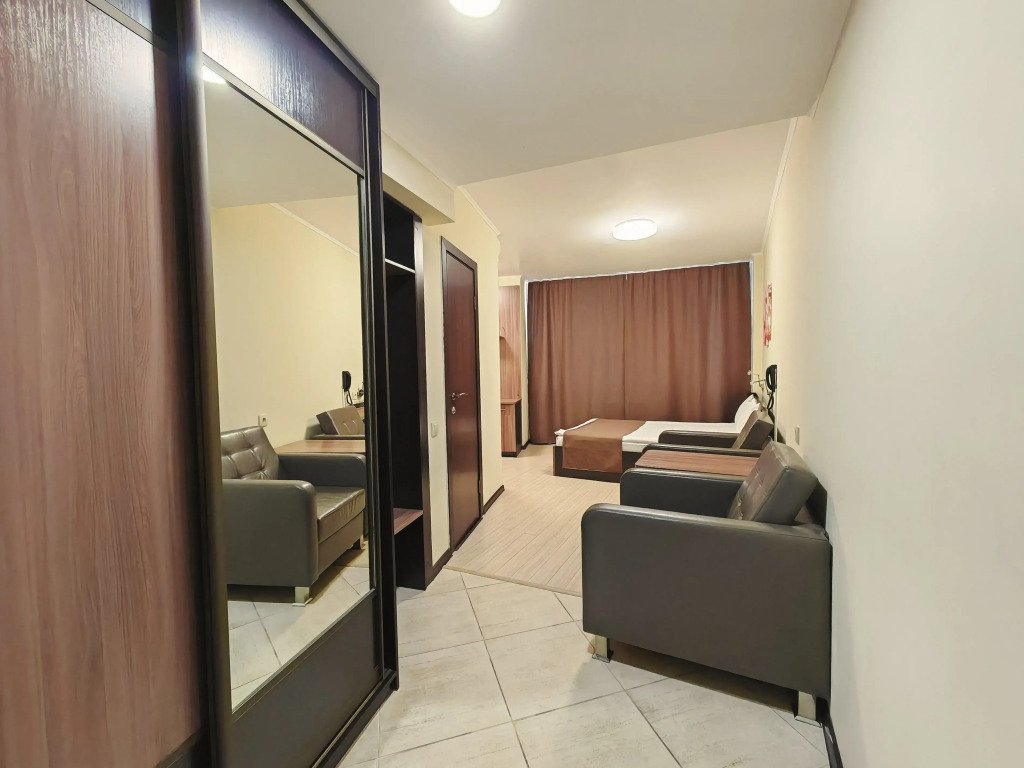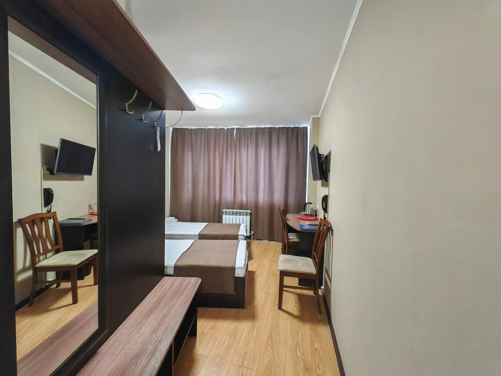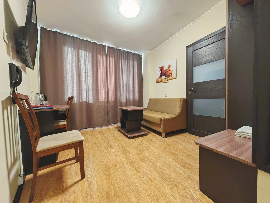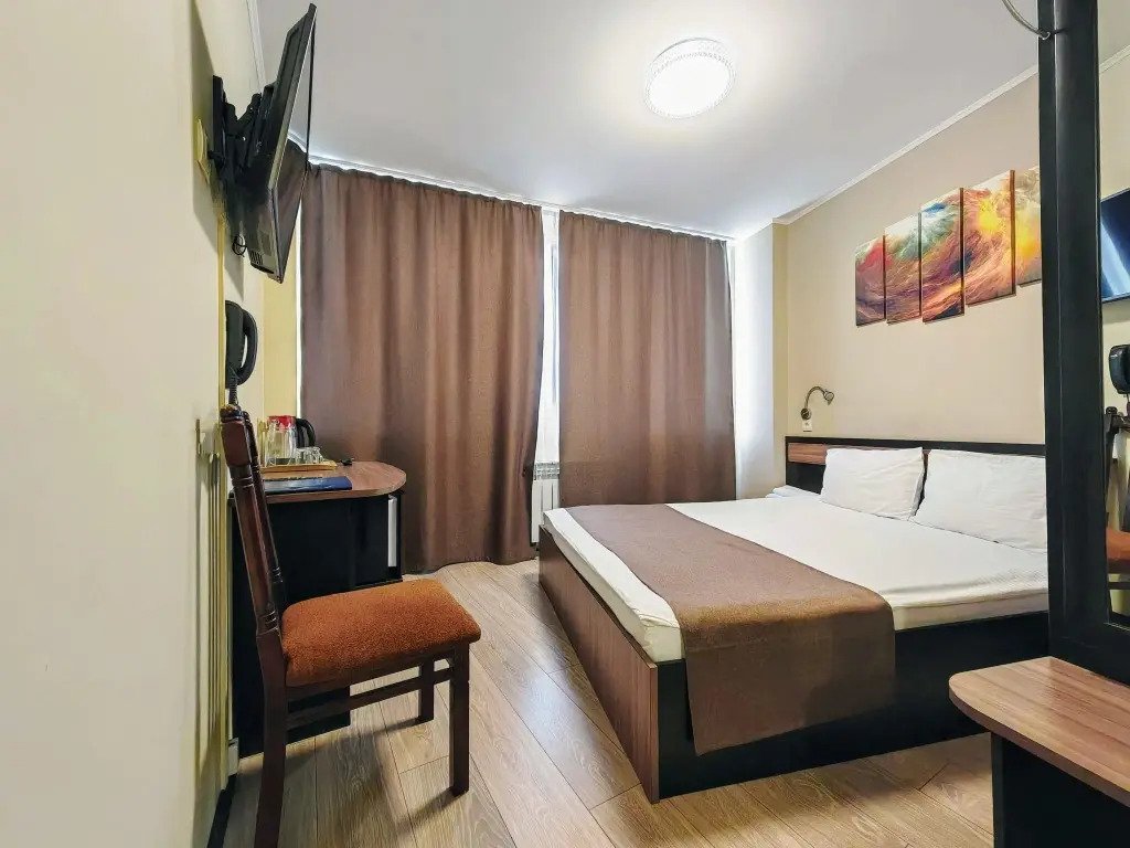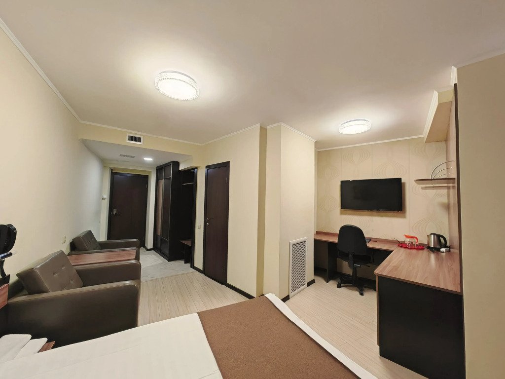 Номер уютно обставлен и оснащён необходимым, чтобы отдохнуть после долгого и насыщенного дня. Имеются телевизор и халат. Перечисленные услуги есть не во всех номерах.