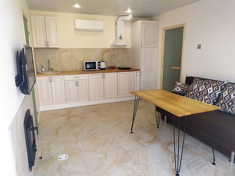 - Гостиная: двуспальный диван-кровать (165 х 200), кондиционер, SmartTV, Wi-Fi.