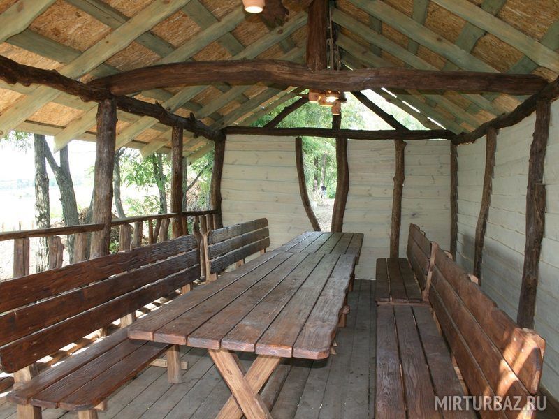 Новые, чистые беседки из натурального дерева оборудованы светом, розеткой, рядом с беседкой стоит мангал. Внутри некоторых беседок расположена настоящая русская печь. Беседки защищены от ветра, при желании защиту можно снять или приоткрыть.