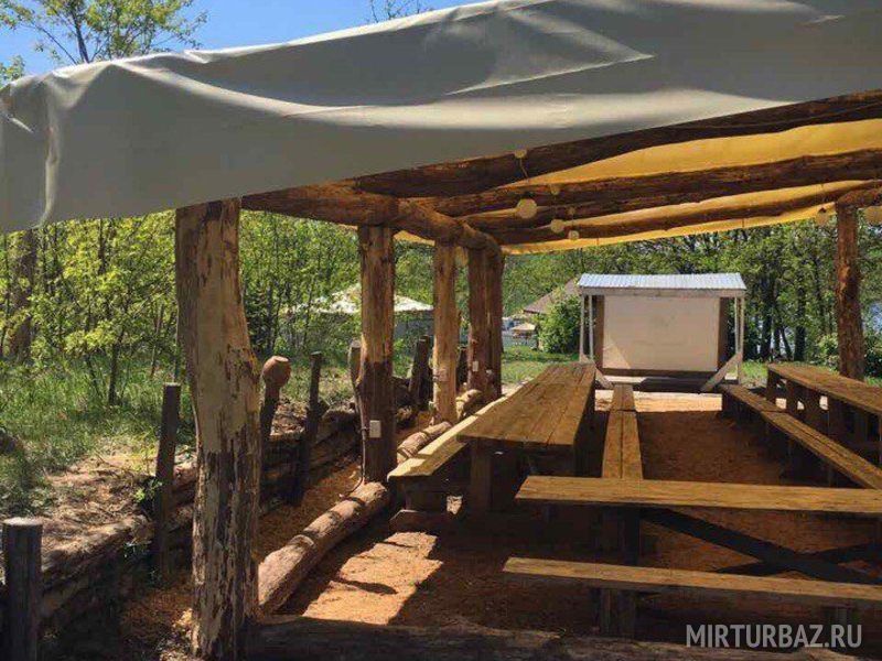 Беседка отлично подойдет для отдыха больших компаний, ведь ее вместимость — 25 взрослых человек. Она оборудована рукомойником, светильниками, розетками, рядом располагается мангал.