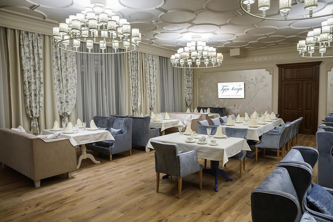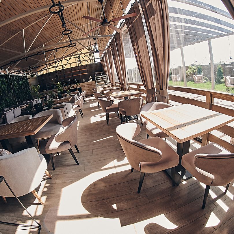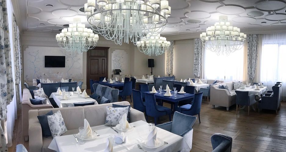 Светлый зал ресторана, интерьер которого выполнен в стиле «Эклектика», рассчитан на 60 посадочных мест, оснащён ж/к экранами и отдельной детской комнатой.