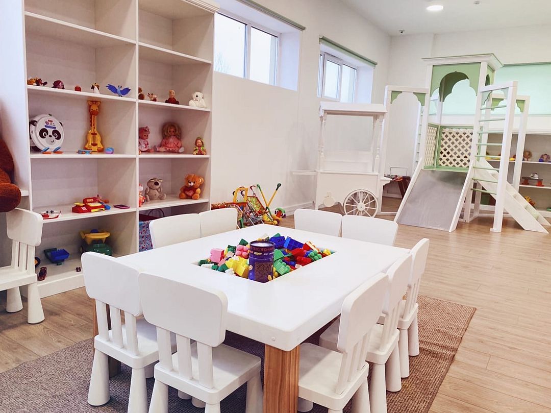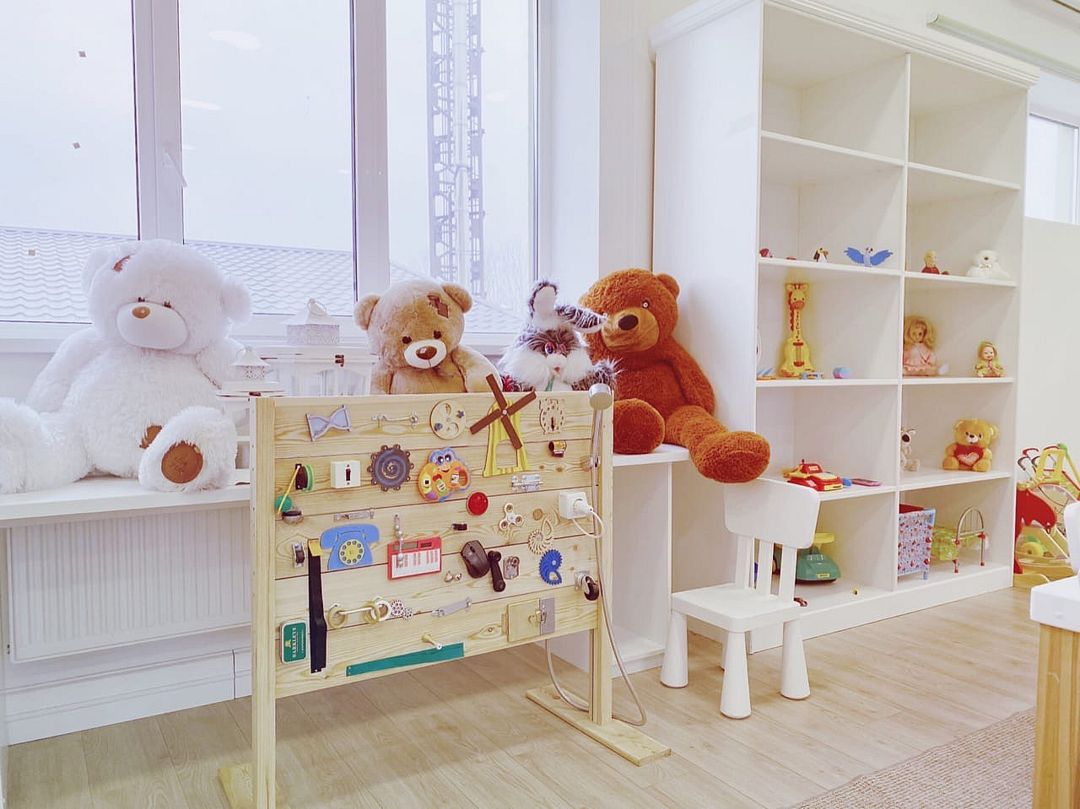 В комнате есть большая коллекция мягких игрушек, разнообразный бизиборд и настоящий домик.