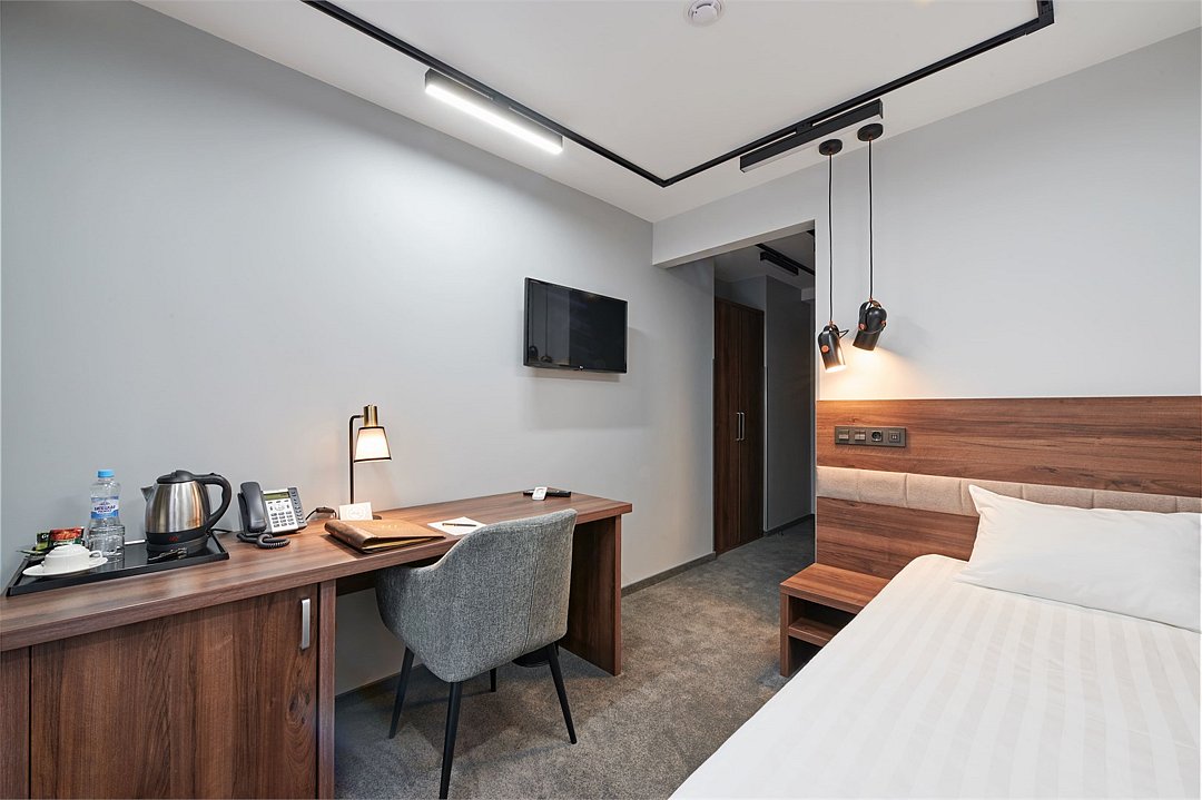 32 стильных уютных номера площадью 14-16 кв. м. При лаконичном дизайне интерьера здесь созданы все условия для полноценной работы и отдыха. Идеальный вариант для гостей, ценящих хороший сервис и комфорт при умеренных затратах на проживание. Функциональное рабочее место и удобная спальная зона, телевизор, услуги связи, сейф, кондиционер и мини-бар. В ванной комнате к услугам гостей все необходимые принадлежности для комфортного пребывания.Услуги и удобства