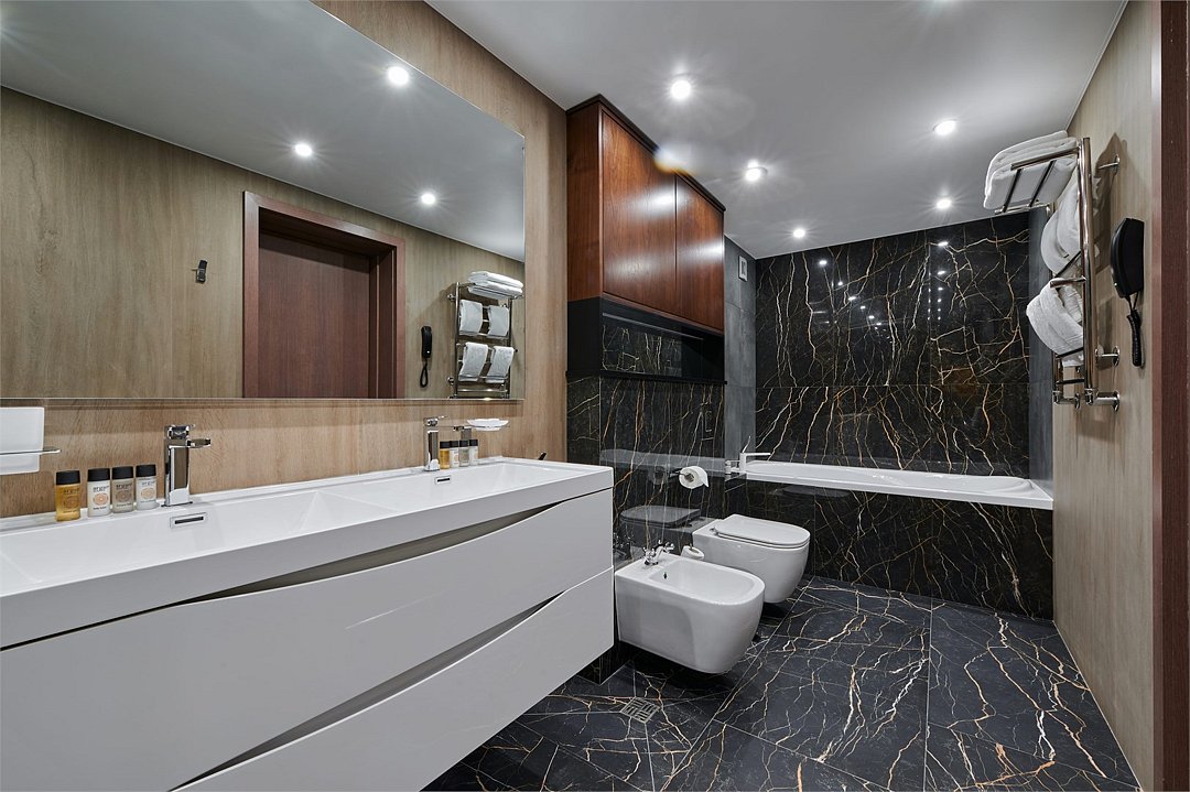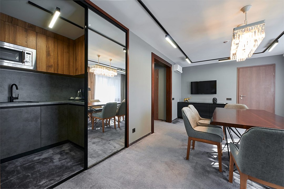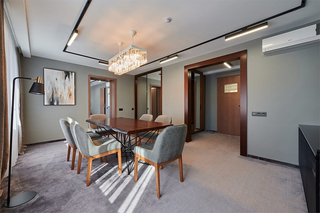 Вкусы самых взыскательных гостей удовлетворят 2 великолепных трехкомнатных номера, каждый площадью более 80 кв.м. Предлагаем Вам погрузиться в чарующую атмосферу роскоши в сочетании с ощущением домашнего уюта. В Вашем распоряжении просторный рабочий кабинет с комфортной зоной для отдыха, гостиная с обеденным столом на 8 персон и кухонной зоной, спальня с большой удобной кроватью, гостевая туалетная комната. Гостям открывается возможность насладиться услугами Релакс-центра на протяжении 2 часов во время их пребывания. Для этого потребуется предварительная запись у администратора стойки ресепшн.Услуги и удобства
