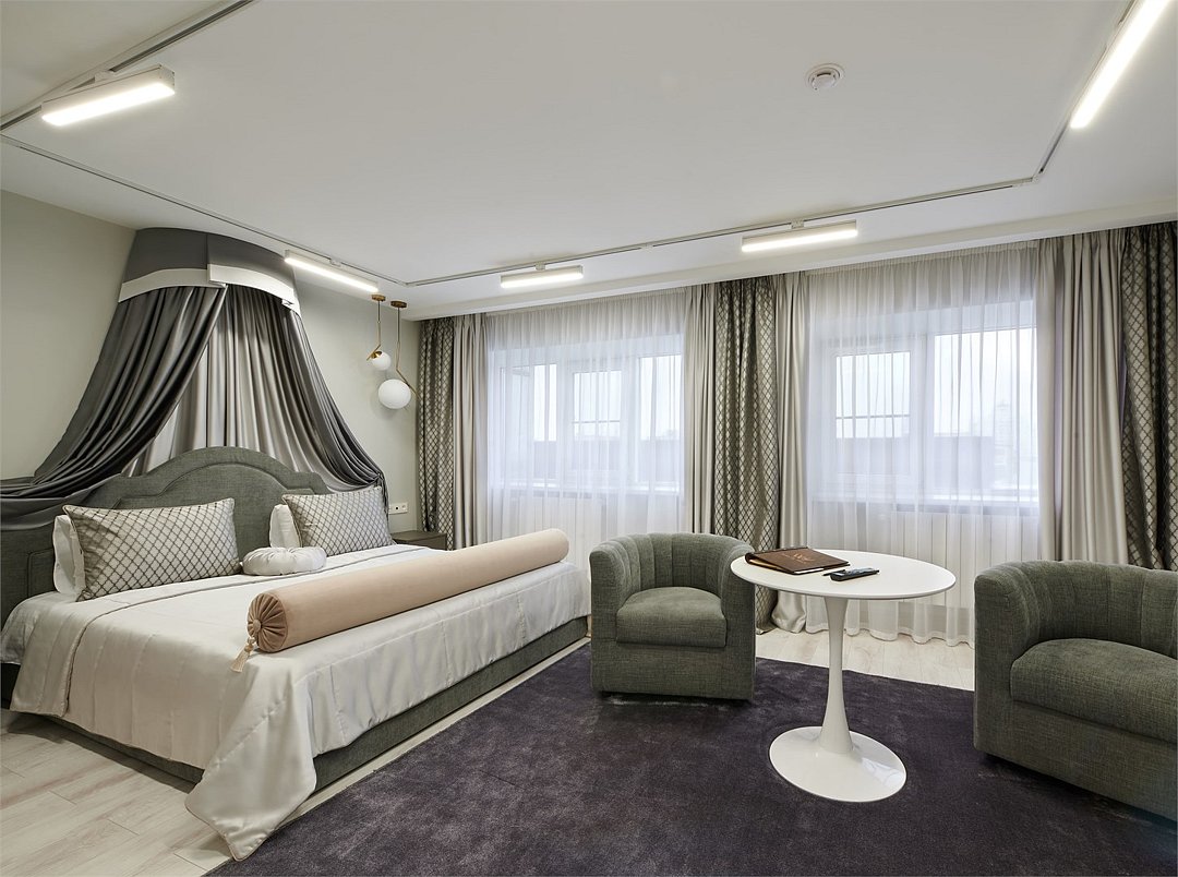 4 номера, каждый площадью более 50 кв. м., представляющие из себя эксклюзивные апартаменты, – олицетворение утонченного стиля и элегантности. В распоряжении гостей комната с роскошной кроватью и светлая уютная гостиная. Обеденный стол на 6 персон и стильная мягкая мебель позволят принять здесь посетителей на высшем уровне. Уединенную атмосферу рабочей зоны номера деловые люди оценят по достоинству. Гостям открывается возможность насладиться услугами Релакс-центра на протяжении 2 часов во время их пребывания. Для этого потребуется предварительная запись у администратора стойки ресепшн.Услуги и удобства
