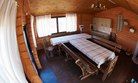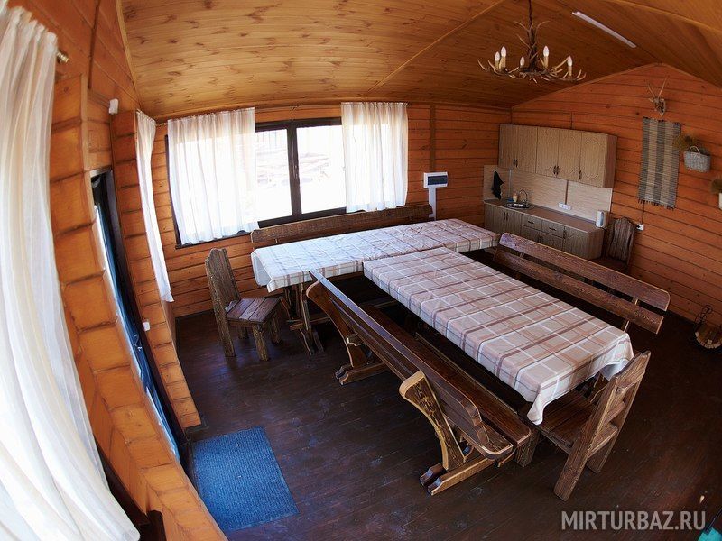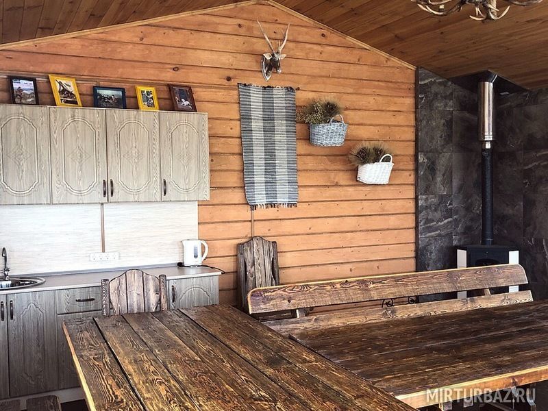 Состоит из двух комнат: кухни и банкетной зоны. На кухне для гостей подготовлены столовые приборы, керамическая посуда, кухонные принадлежности, большой холодильник.
