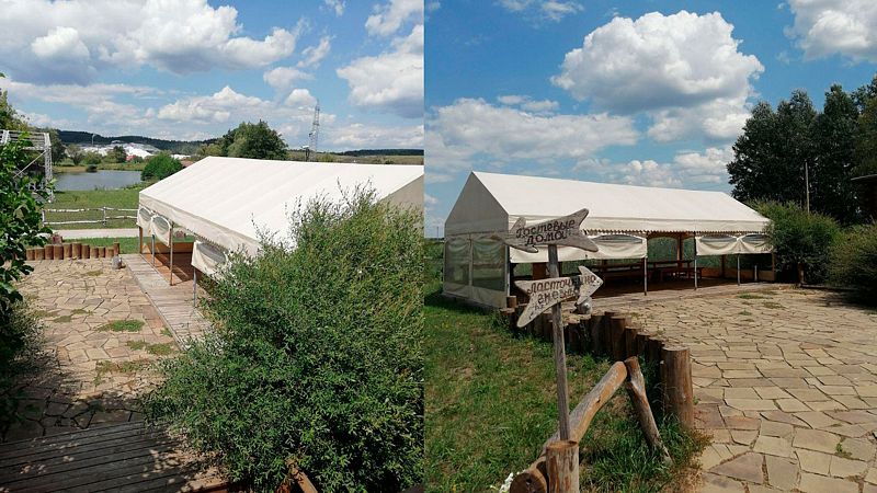 С панорамным остеклением. Вмещает до 62 человек. Расположен рядом с двумя озерами. Летом в шатре работает кондиционер, в холодное время года — обогреватели. Комфортное время для банкетов — с ранней весны по октябрь.