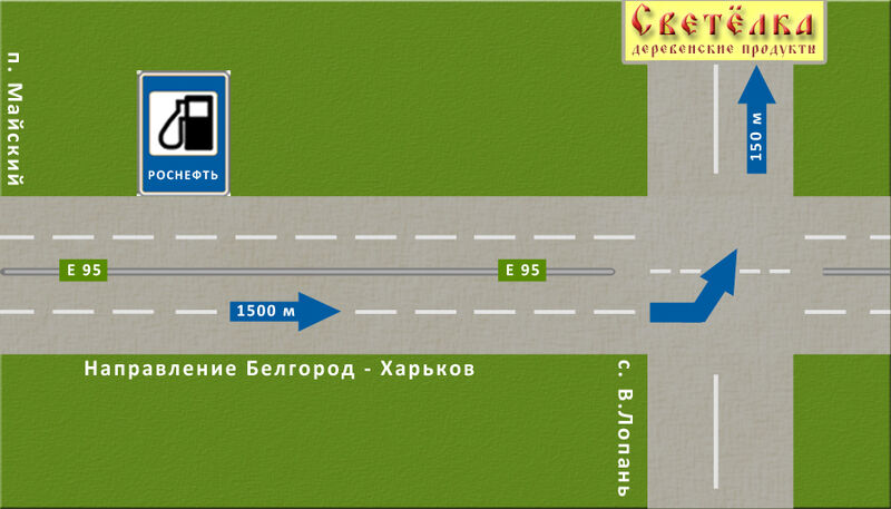 по трассе Белгород-Харьков за п.Майский (после с. Новая Деревня) на перекрестке «Веселая Лопань» повернуть налево, ехать 150-200м