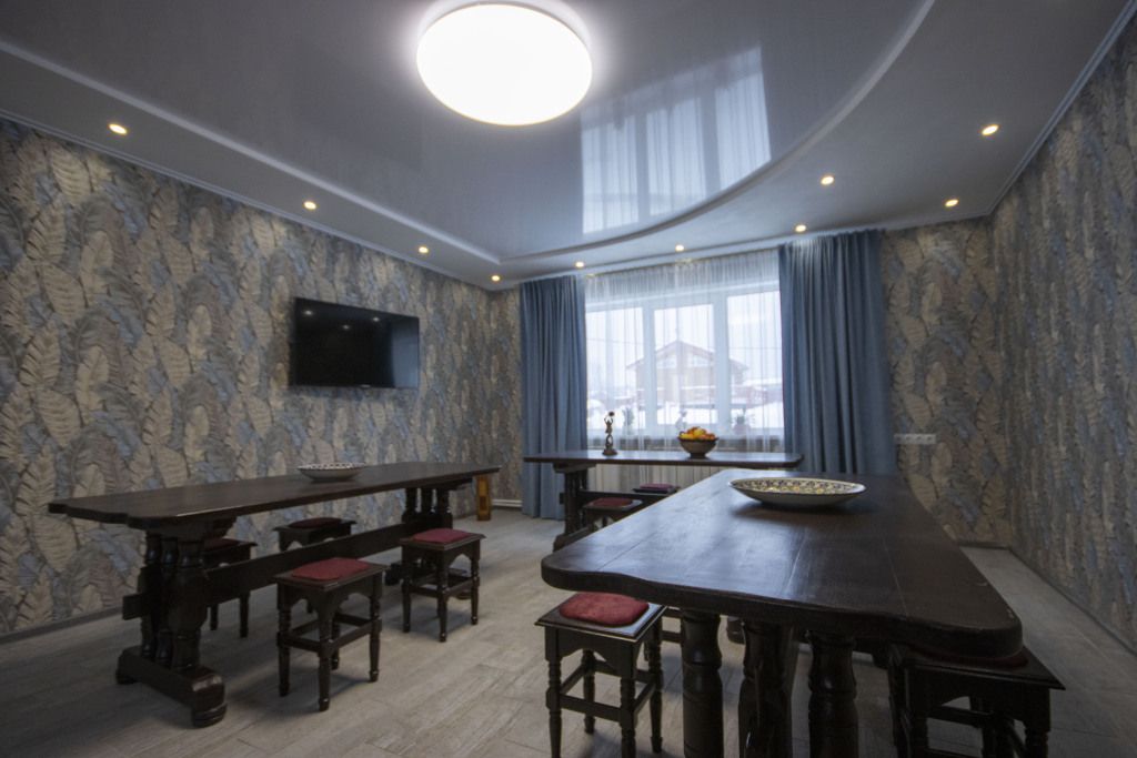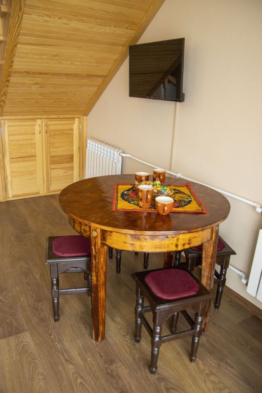 Здесь есть все необходимое, чтобы приготовить, например: вкусный шашлык, плов или копченую рыбку. А за большим деревянным столом сможет уместиться компания из 16 человек.