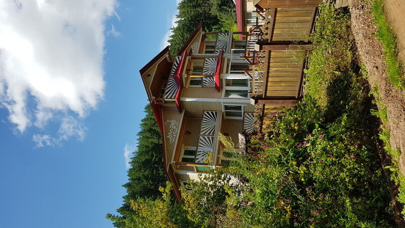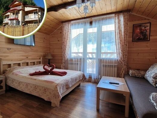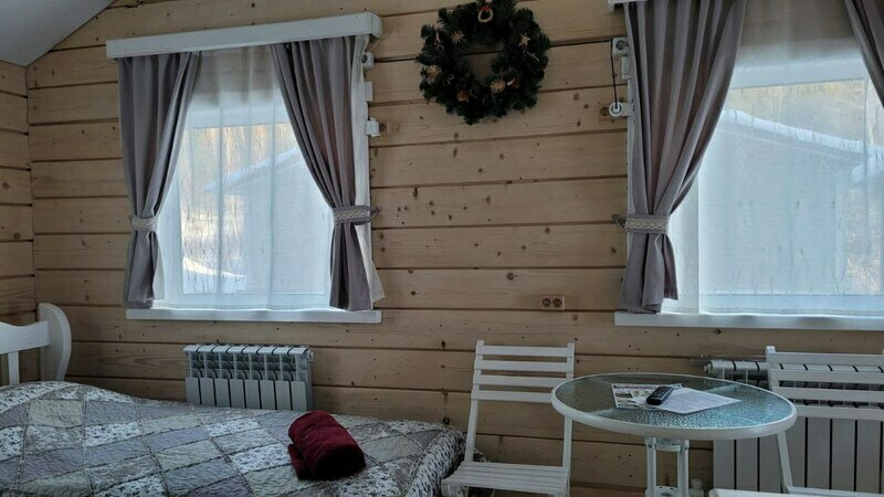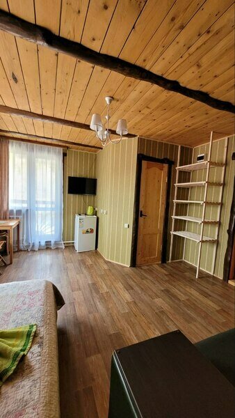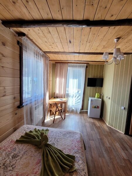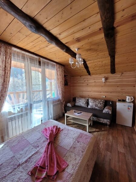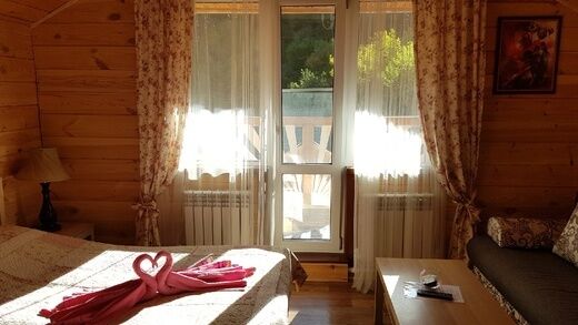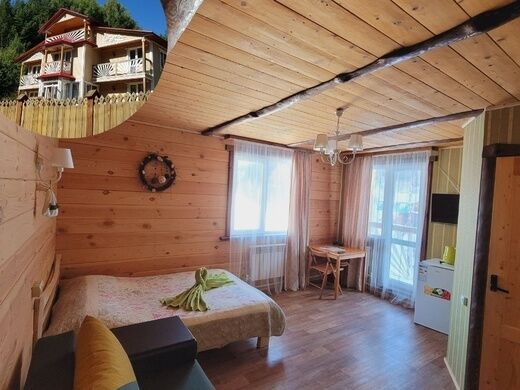 Тип номера "Превосходный" (Delux). Просторный, светлый номер 18 кв. метров, с собственным сан-узлом, душевой и умывальником. В номере большое окно и лоджия! На лоджии можно устроить чаепитие или романтический вечер-для этого все благоволит ... Потрясающий вид из окон на сосновый лес и горы.