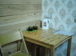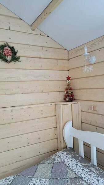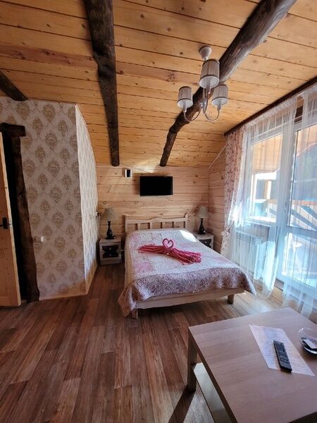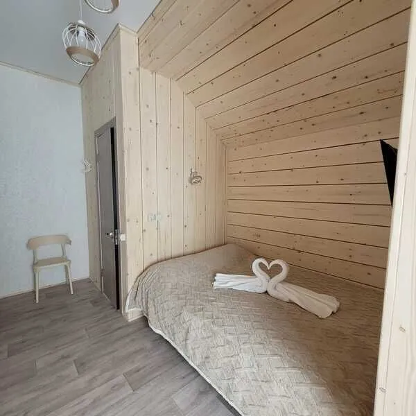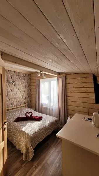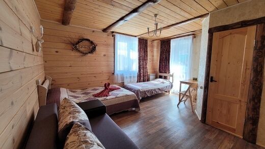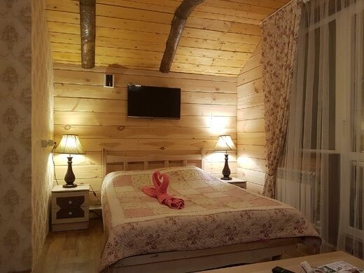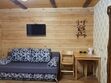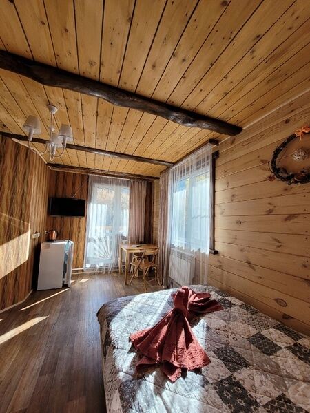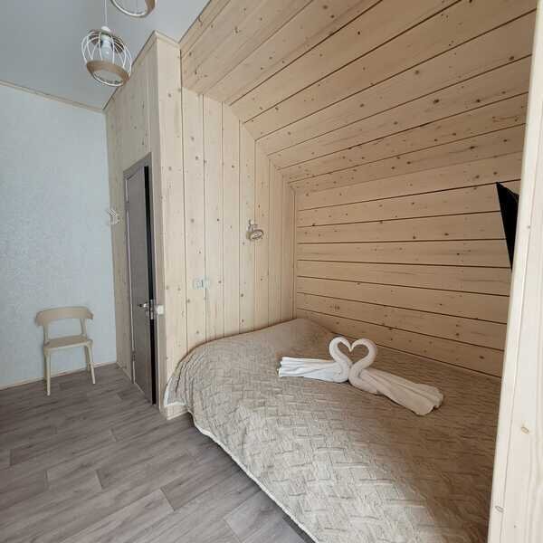 Номер выполнен в ЭКО-стиле, отделка произведена древесиной хвойных пород. Комната декорирована эксклюзивными элементами интерьера ручной работы.