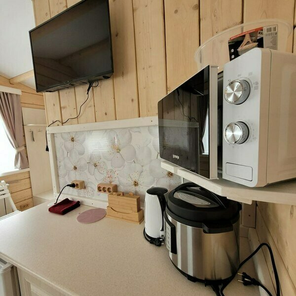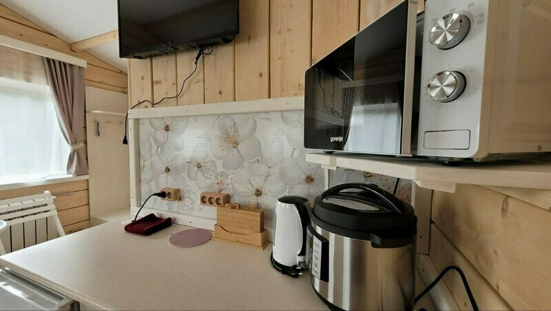 Кухня-столовая оборудована всей необходимой бытовой техникой (холодильник, электроплита с духовкой, мультиварка, микроволновая печь, электрочайник, телевизор), посудой (до 20 персон).