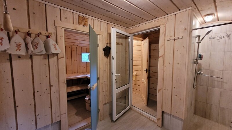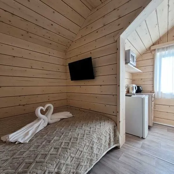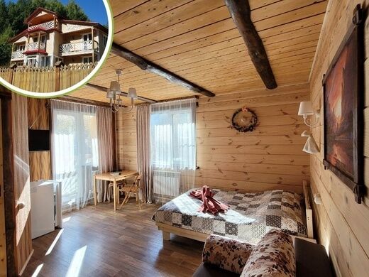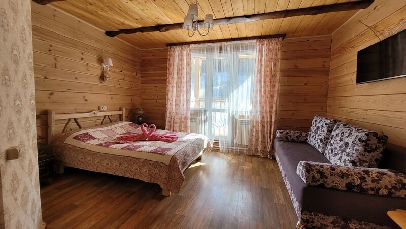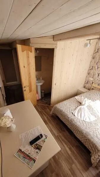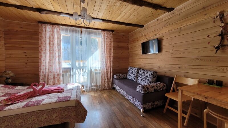 Тип номера "Превосходный" (Delux). Просторный, светлый номер 20 кв. метров, с собственным сан-узлом, душевой и умывальником. В номере два больших окна и балкон. Вид из окон на сосновый лес и горы.