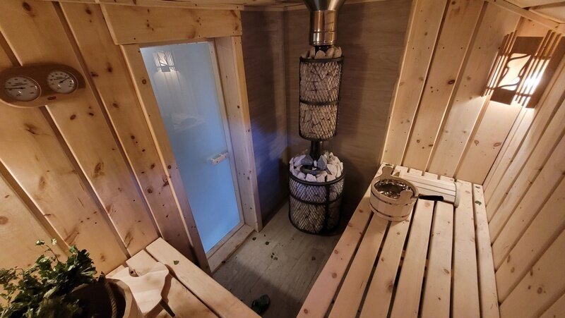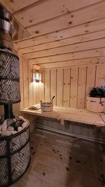 Парная из кедра и титулованная чугунная печь с внутренней каменкой.