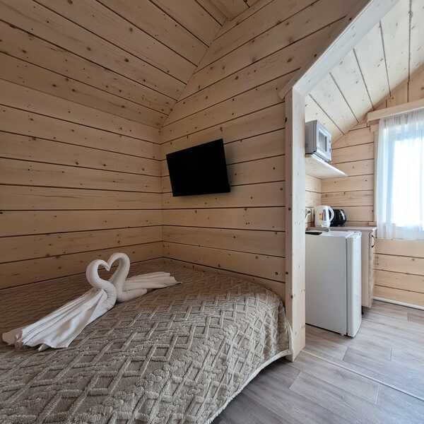 Тип номера "Превосходный" (Delux). Просторный, светлый номер 18 кв. метров, с собственным сан-узлом, душевой и умывальником. В номере балкон с видом на сосновый лес и горы.