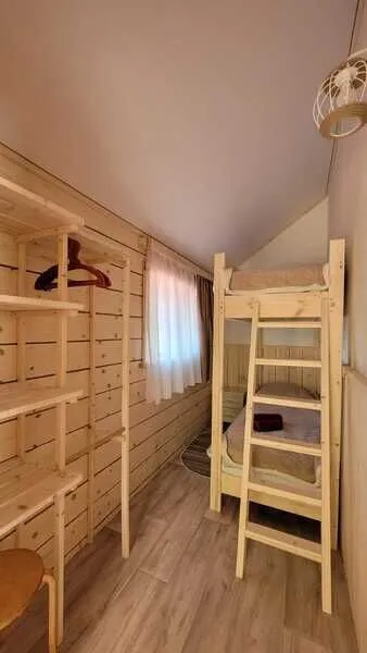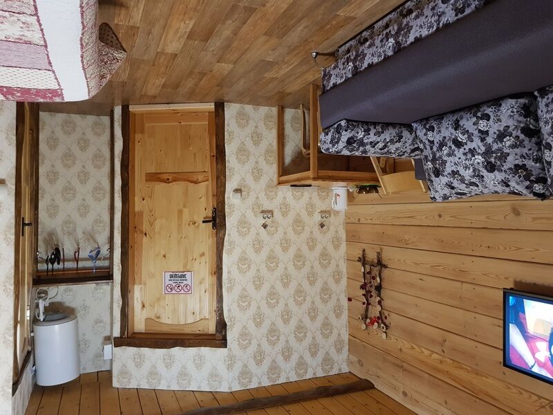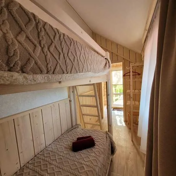 Одна двуспальная кровать, одна двухъярусная кроватьВ мини-доме