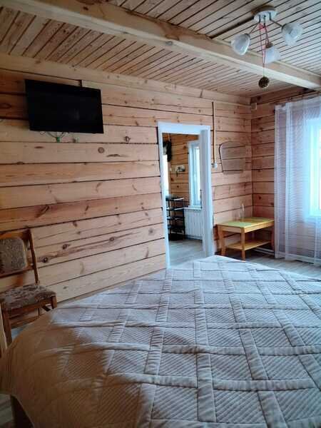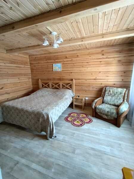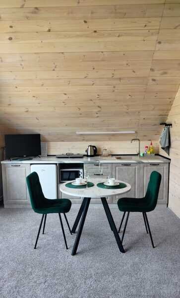 Номер с двуспальной кроватью и креслом-кроватью. Есть личный санузел, кухня-столовая.