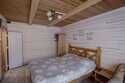 Номер с двуспальной кроватью с голубых тонах. Есть личный санузел, кухня-столовая.