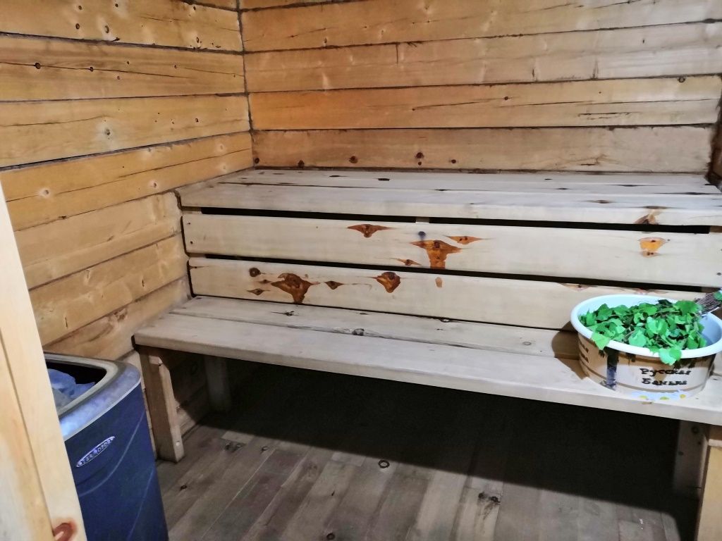 В стоимость входят тапочки и простыни. Дополнительно можно заказать травяной чай с медом и березовые веники.