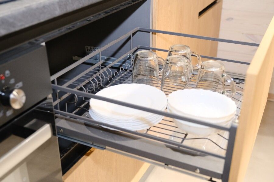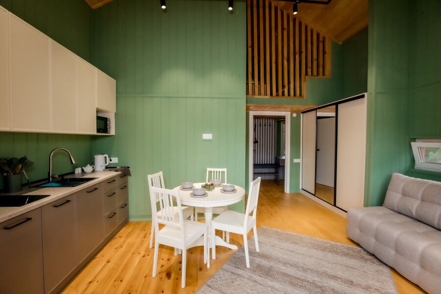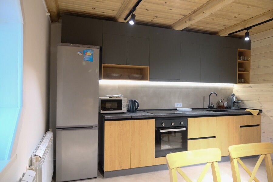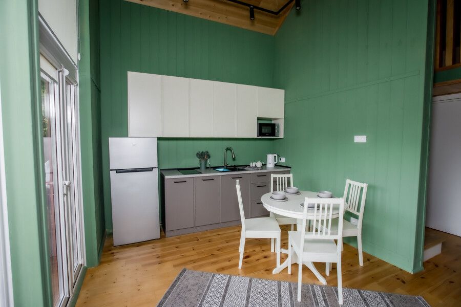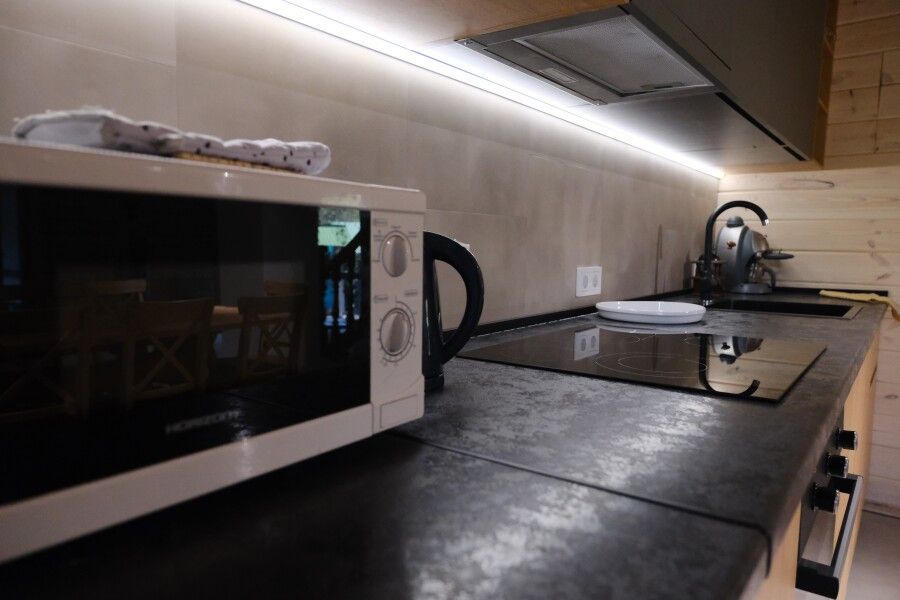 • Кухонная и обеденная зоны с посудой, чайником, варочной панелью, микроволновкой, холодильником;
