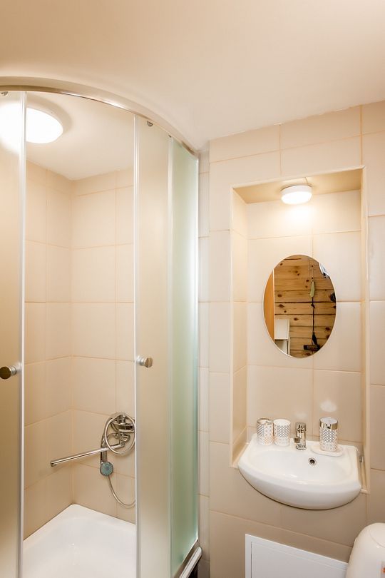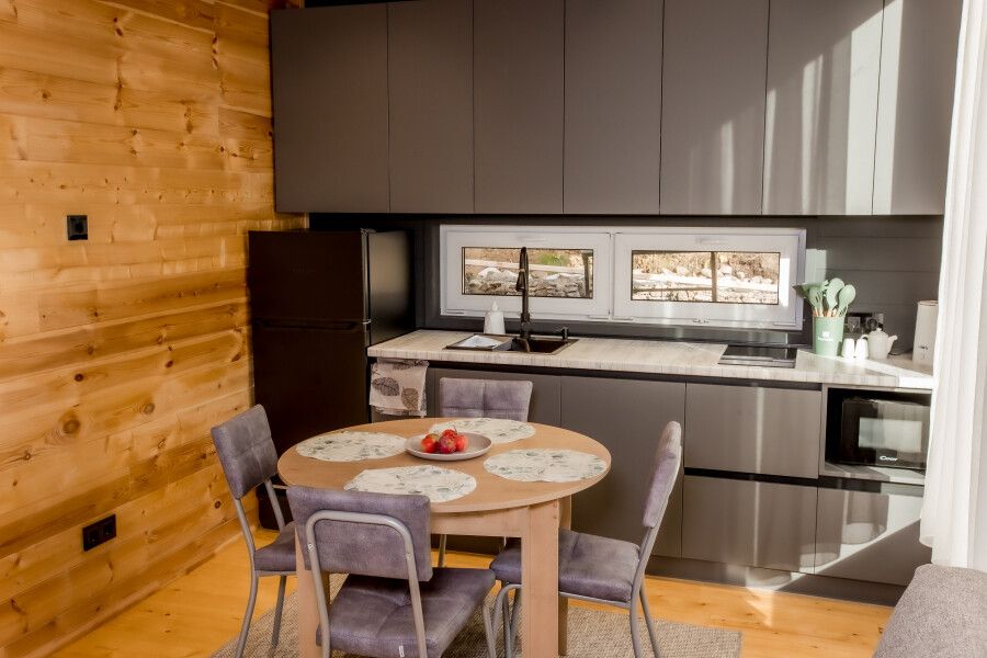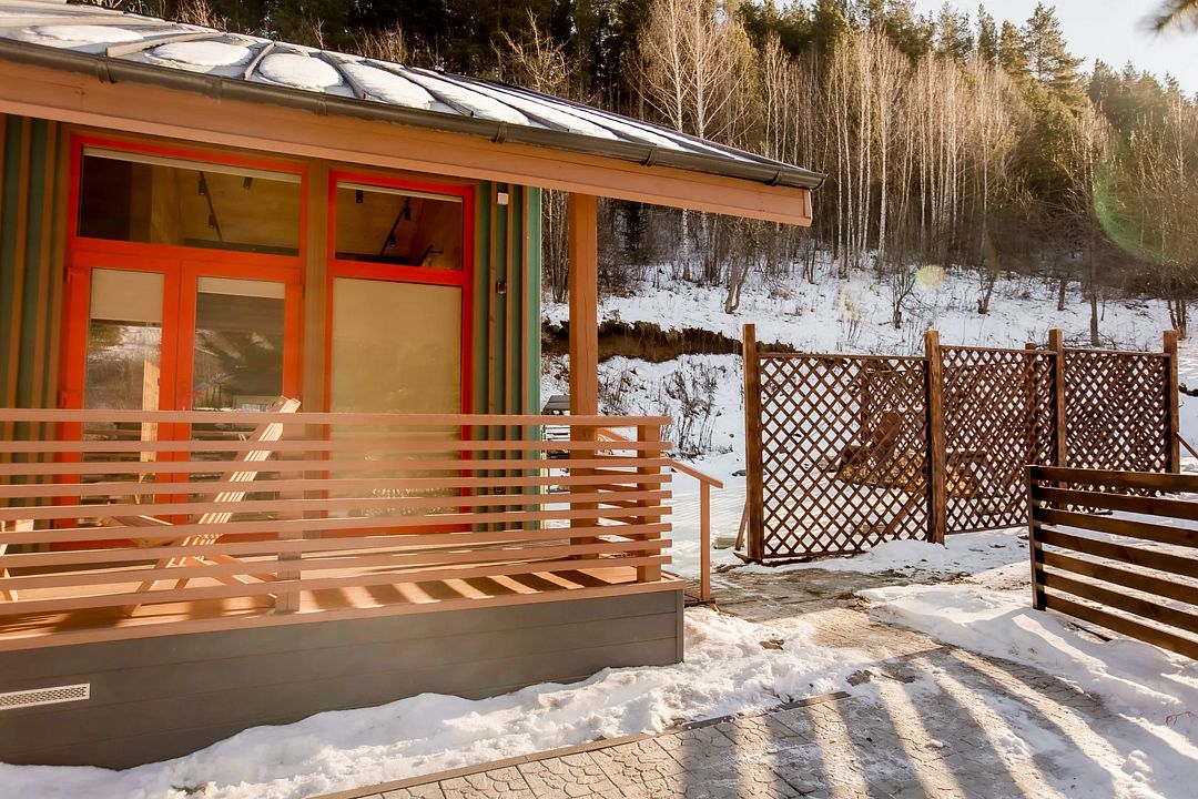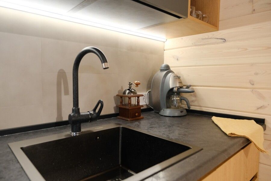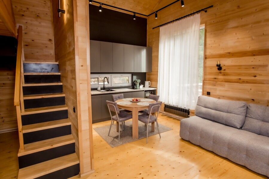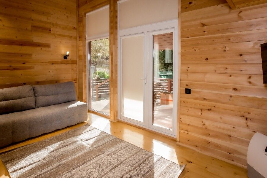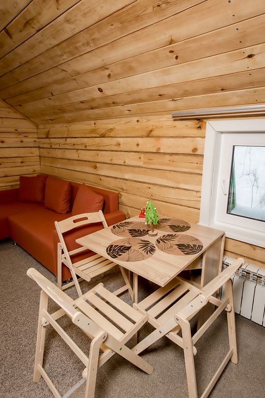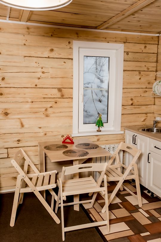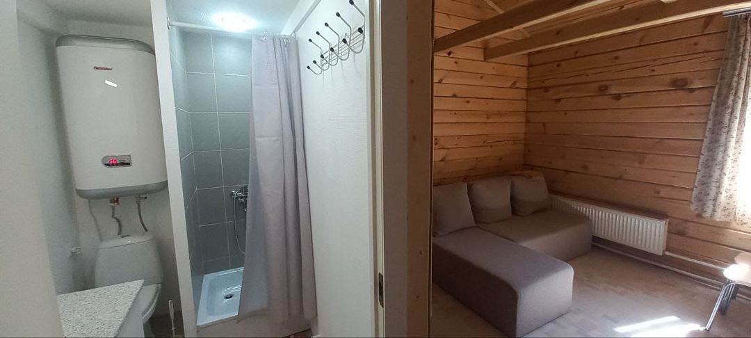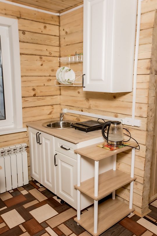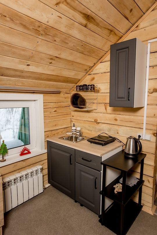 Нам очень понравился и сам домик, очень уютный, добротно сделан, всего в меру, хоть и раковины для мытья посуды нет, приходилось мыть в ванне посуду, но мы к этому уже на третий день привыкли.