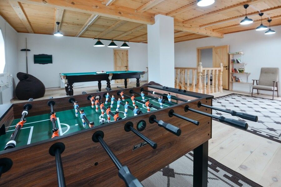 зона отдыха (телевизор, бильярдный стол, настольный футбол, лаунж-зона с пуфами, книги, настольные игры).