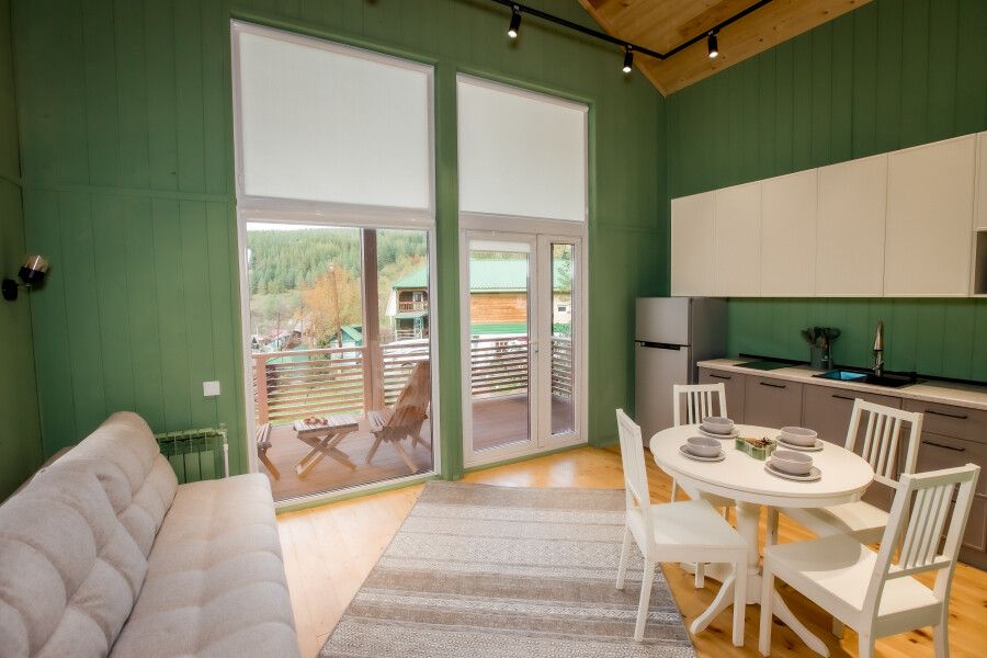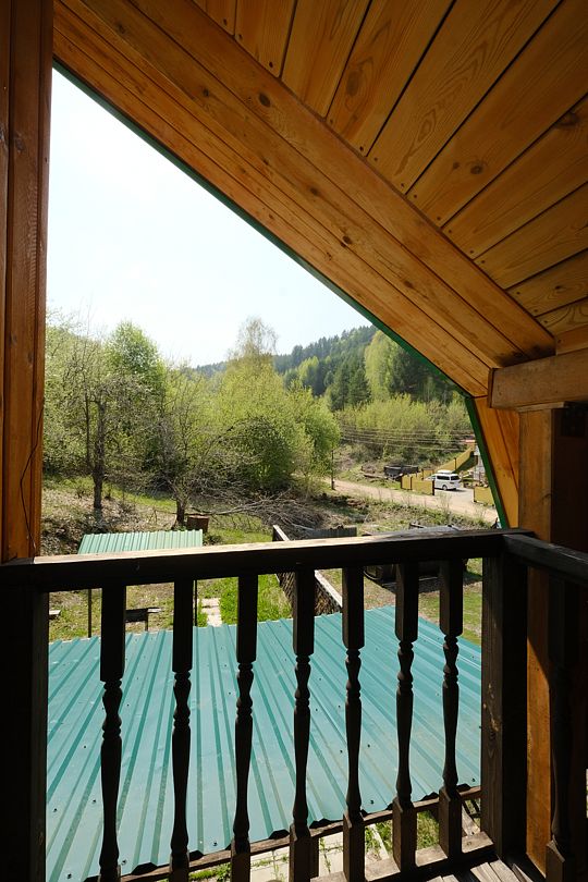 Видовой двухуровневый номер с панорамными окнами и выходом на просторную террасу. Прекрасный обзор на окрестные горы с лесом, сад, тихую улицу. Собственная мангальная зона, уголок для отдыха с качелями.