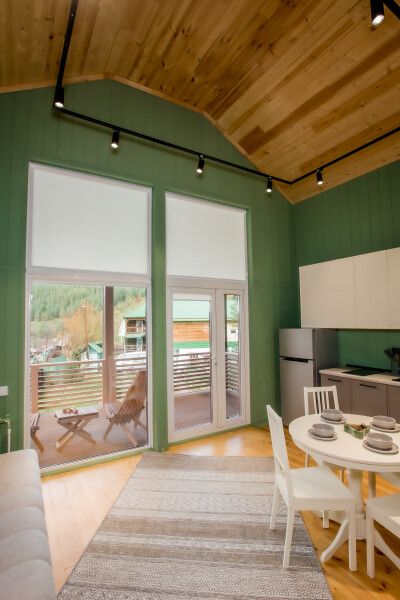 В Большом доме четыре отдельные спальни с верандами: на первом этаже две двух-трехместные спальни, большая гостиная с обеденной зоной и кухней, душевой и туалетом.