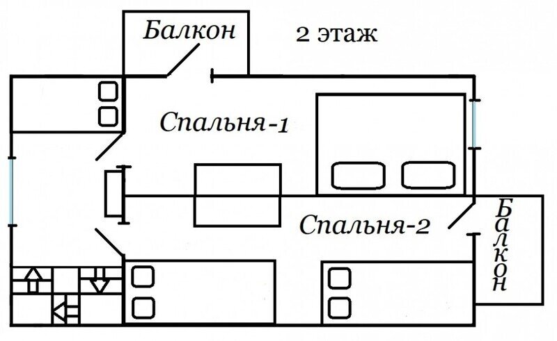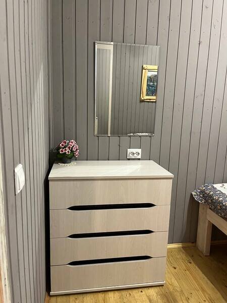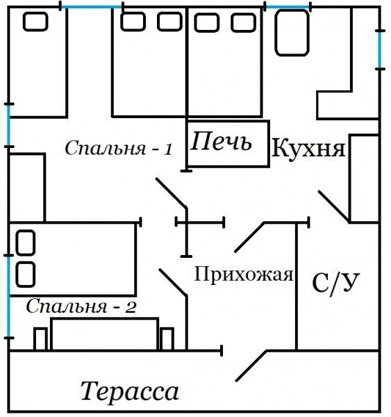 3 двуспальные кровати, двуспальный диван, двуспальное Полати, санузел с душем, ТВ, мини-кухня