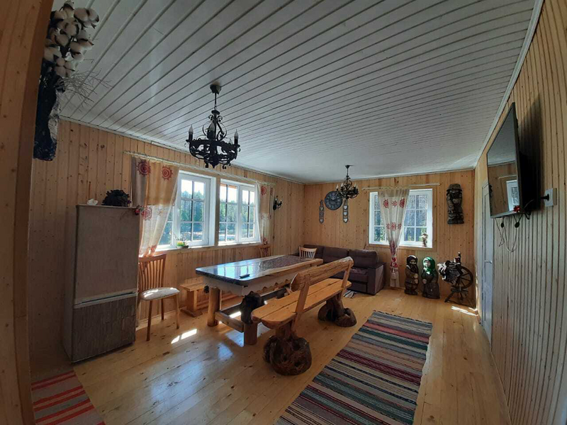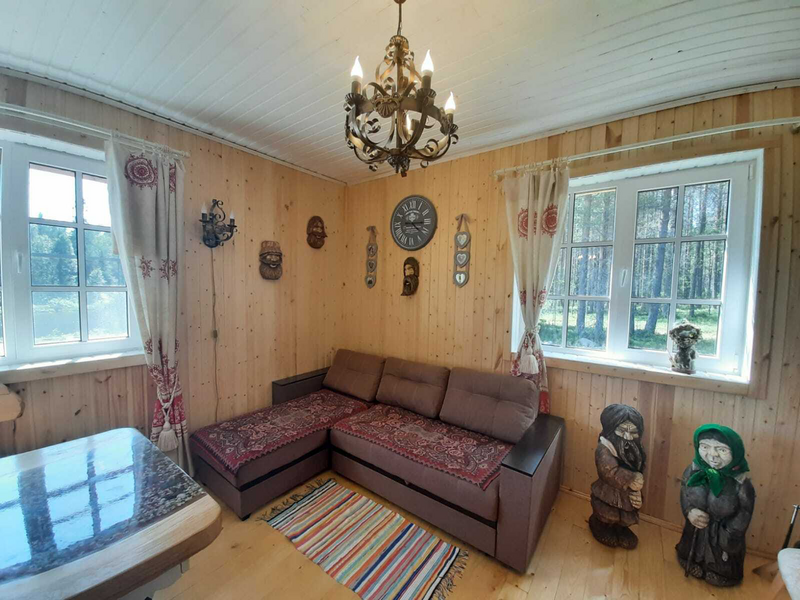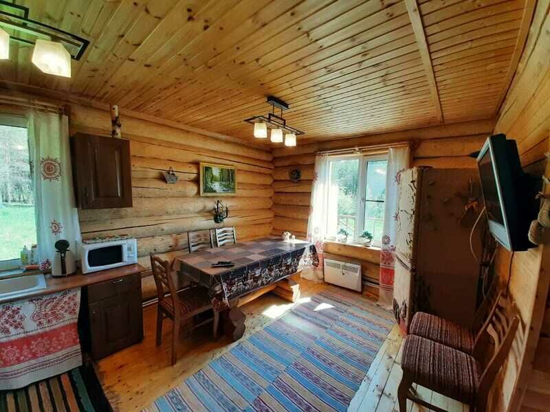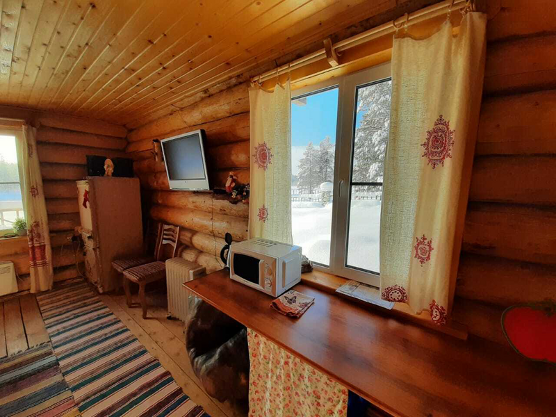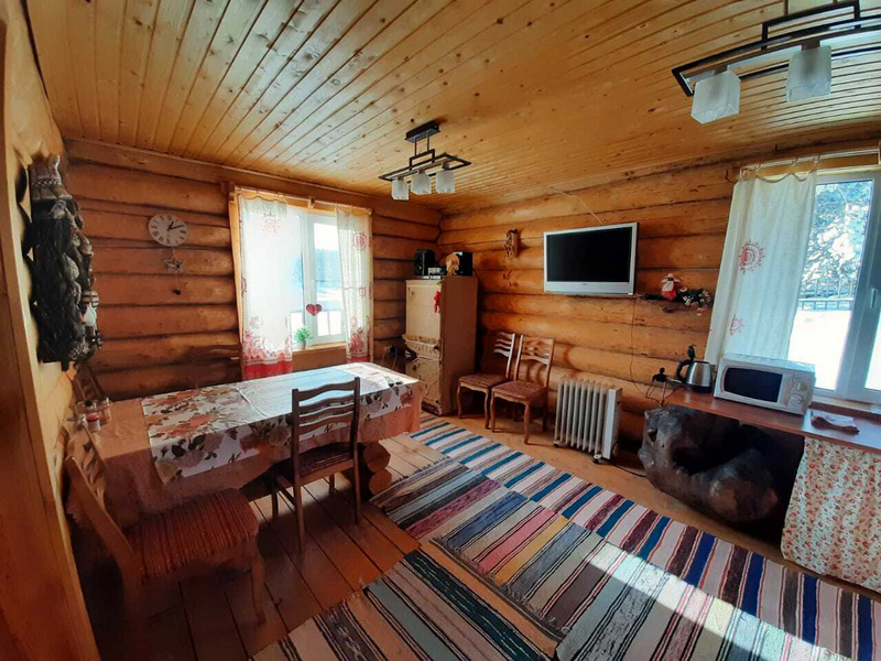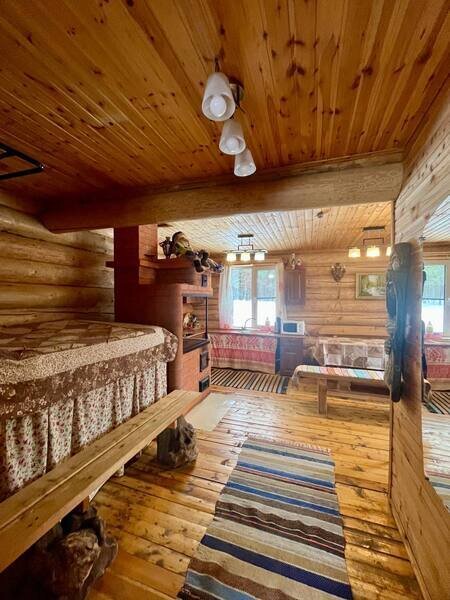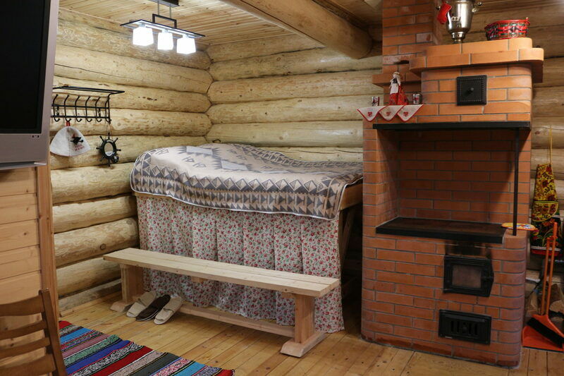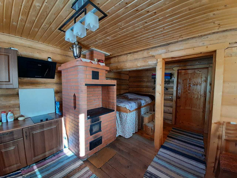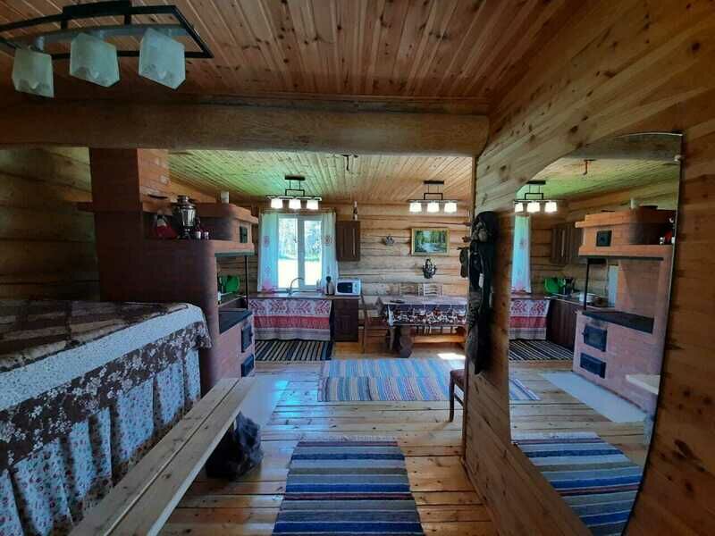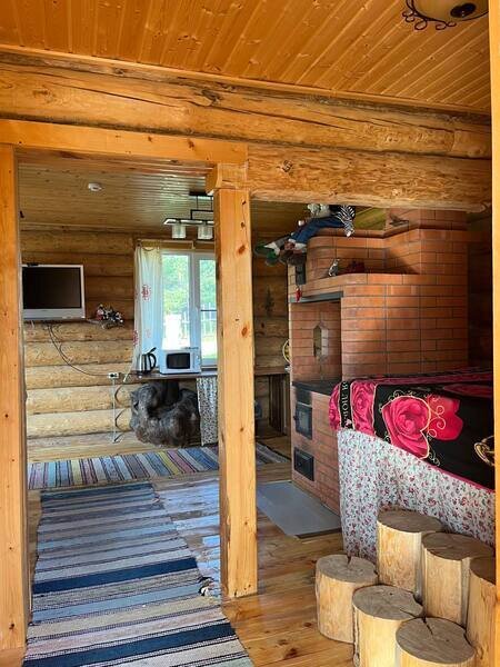 Деревенская изба с русской белой печью. Имеются современная кухня, туалет и ванная. В кухне есть вся необходимая посуда.