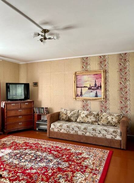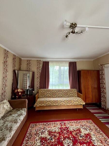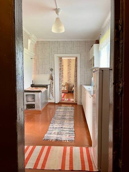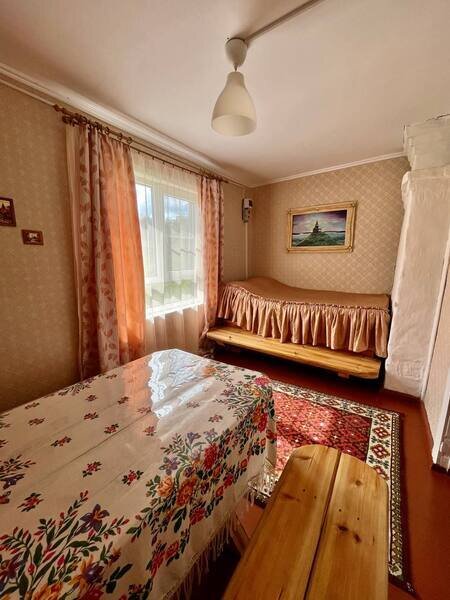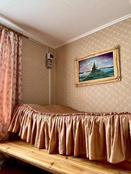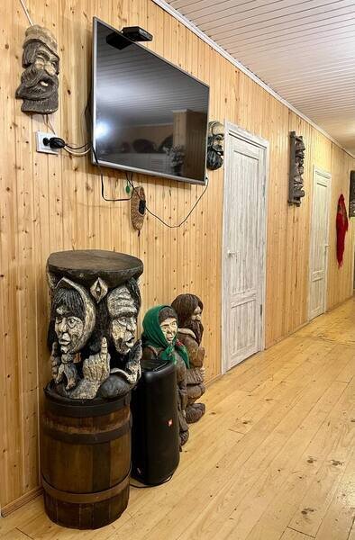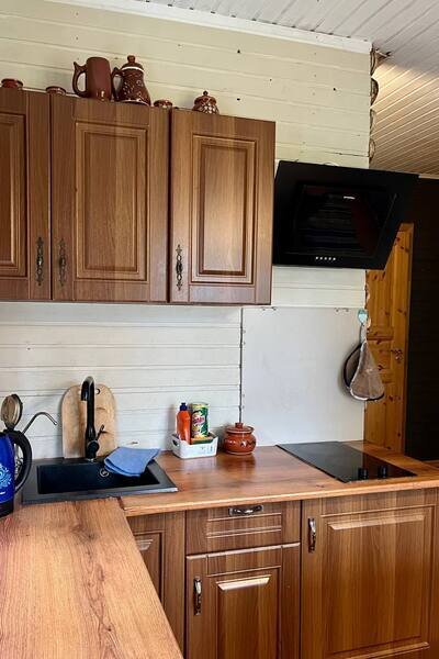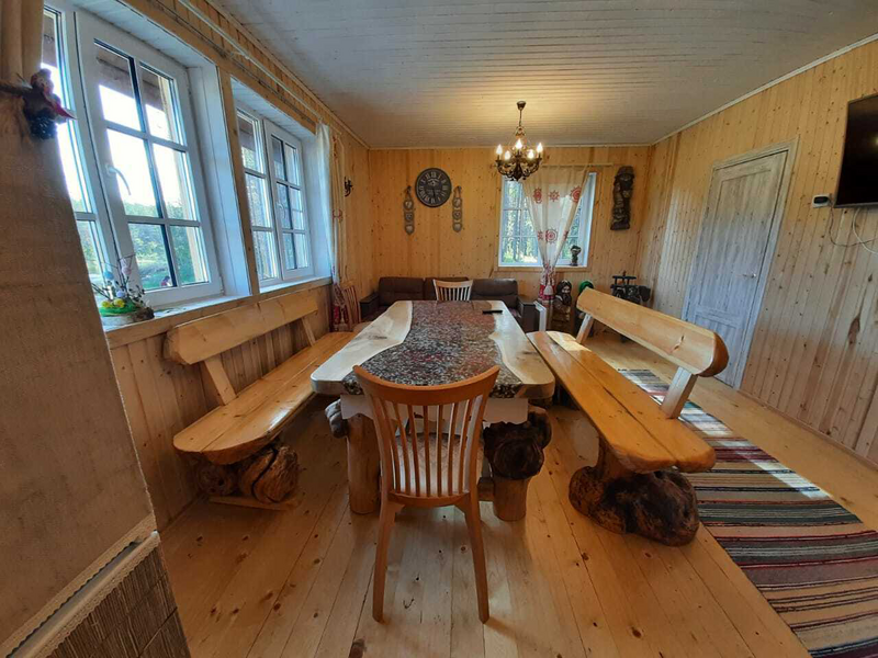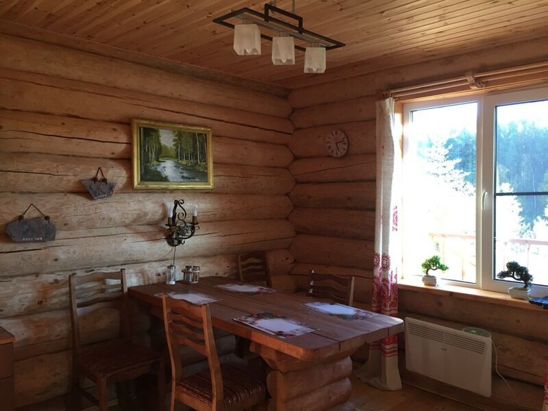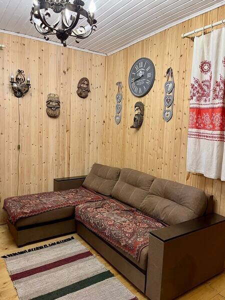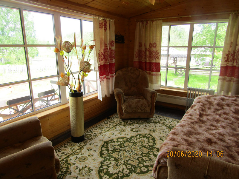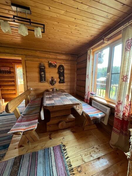 Деревенская изба с русской белой печью. Имеются современная кухня, туалет и ванная. В кухне есть вся необходимая посуда.