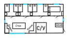 Оснащение: тумбочки, окно, стол, стулья, диван.