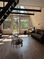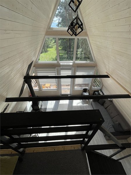 Спокойный отдых в двухэтажном A-frame доме, вместимостью до 7 человек. Витражные окна вид на сосновый лес .