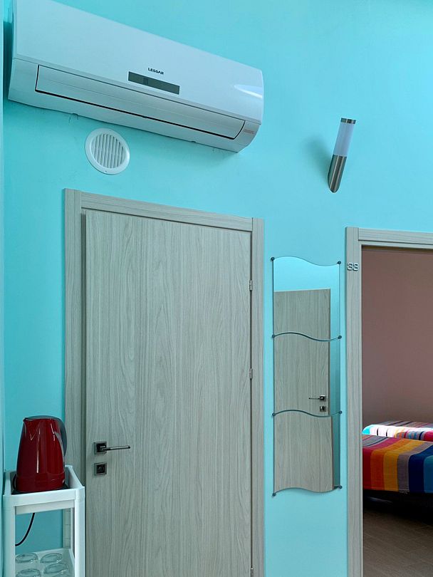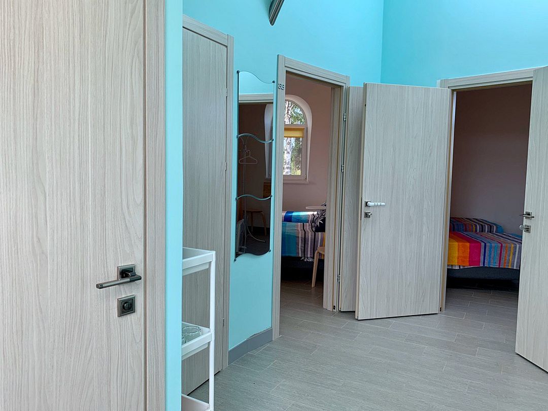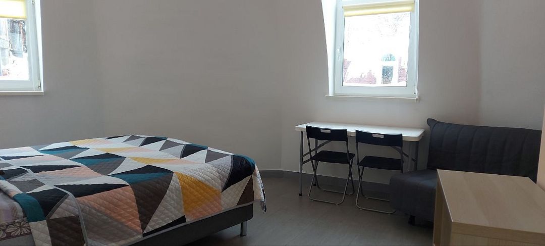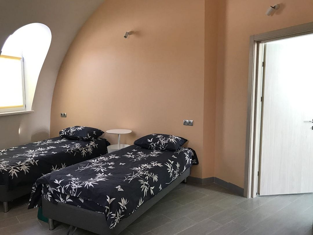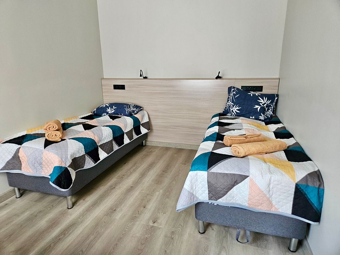 В каждом номере две или три односпальные кровати с ортопедическими матрацами, стулья, вешалки для одежды, тумбы/полки для хранения вещей.