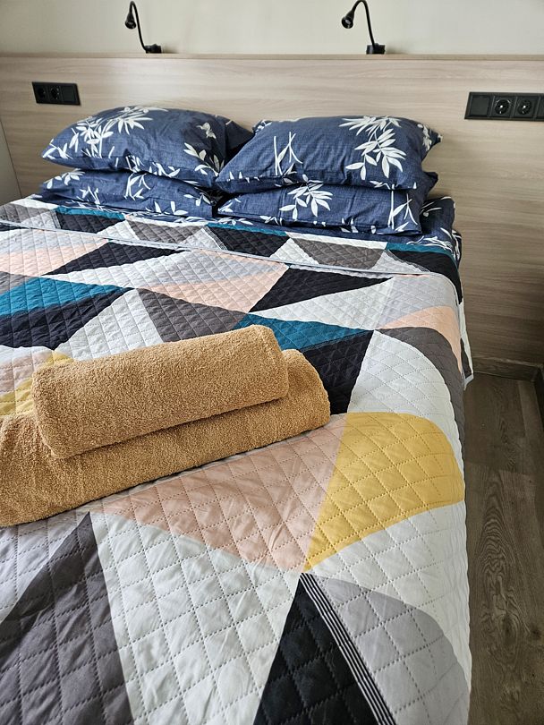 На выбор предлагаются номера с одной двуспальной кроватью или двумя раздельными, постельное белье выдается.