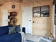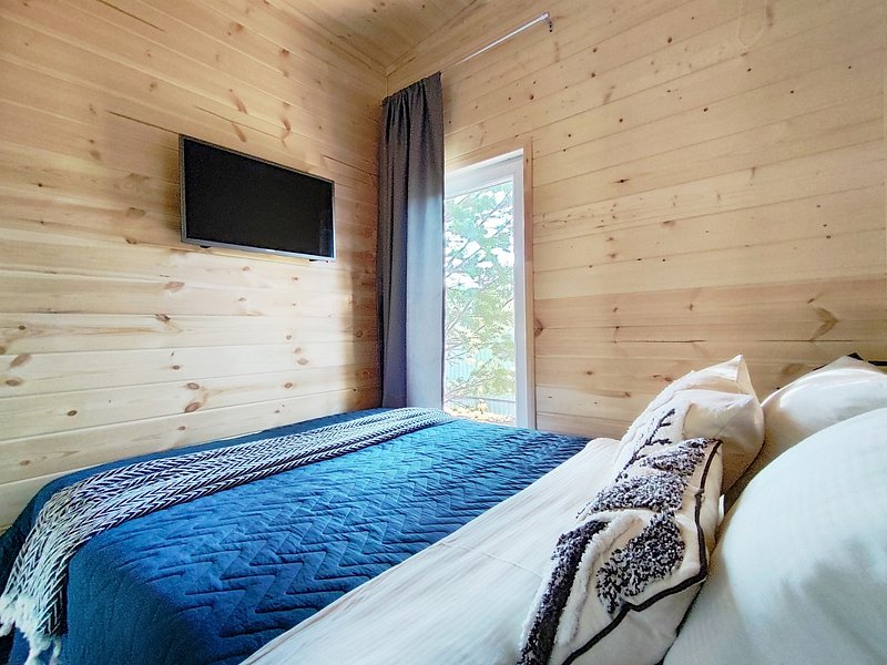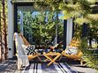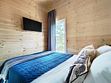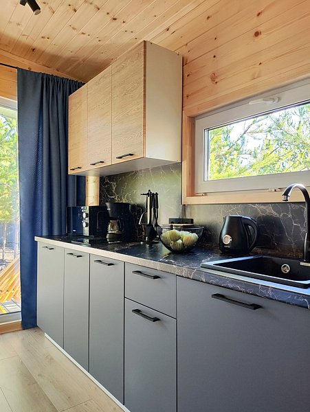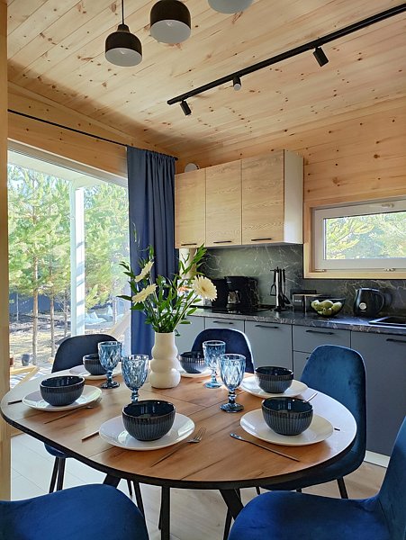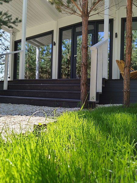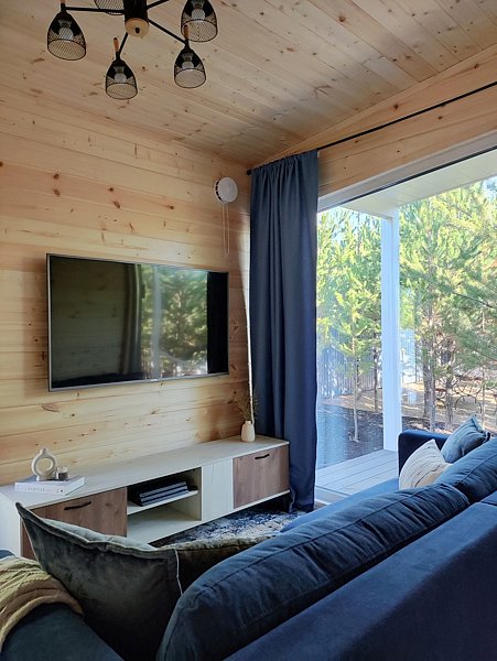 Комфортный дом на 6 человек с панорамными окнами и террасой с видом на сосны.