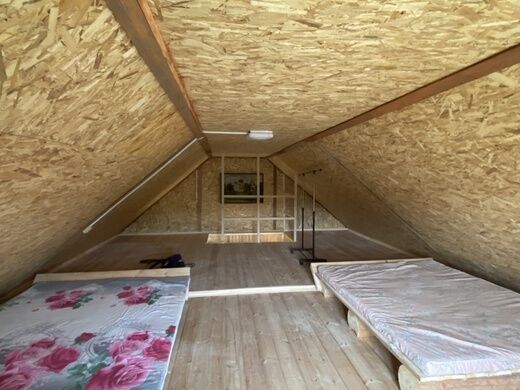 Площадь дома составляет 130 кВ.м, в нем 6 спальных мест: 4 кровати и 2 раскладушки. Естественно в нем есть свой туалет, обеденное пространство и небольшая кухня, холодильник тоже имеется.