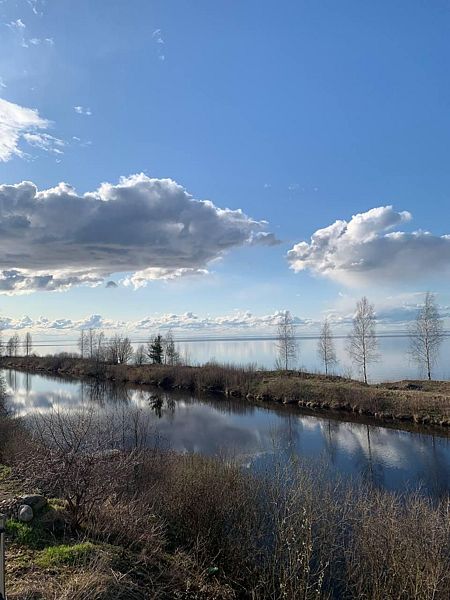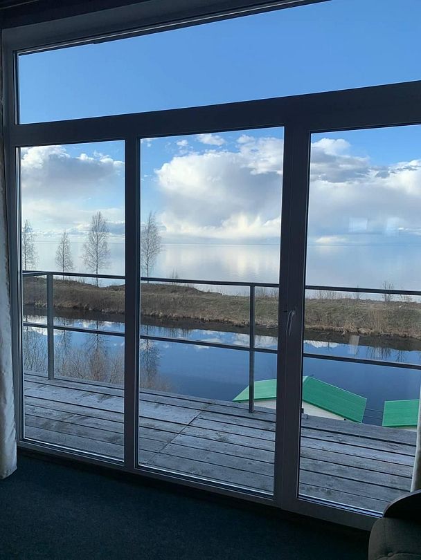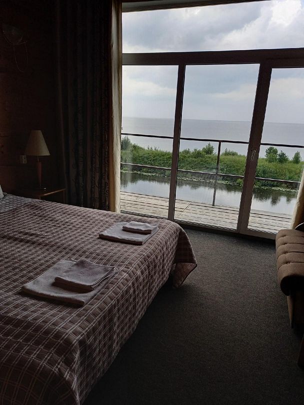 Номер с большой двуспальной кроватью и диваном-кроватью для семейного отдыха с прекрасным видом на просторы Белого озера.