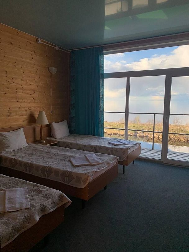Номер с тремя односпальными кроватями и прекрасным видом на просторы Белого озера.