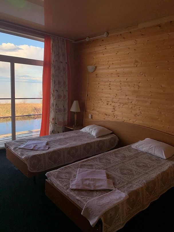 Номер с двумя односпальными кроватями и прекрасным видом на просторы Белого озера.