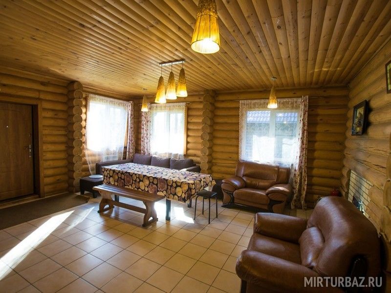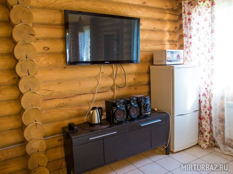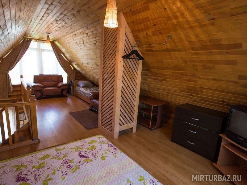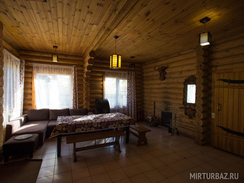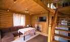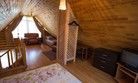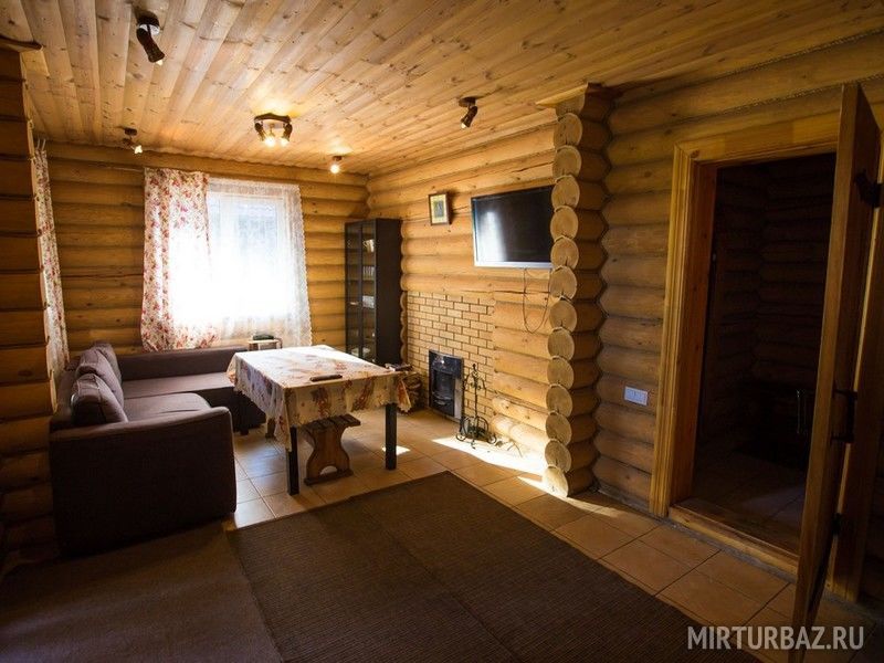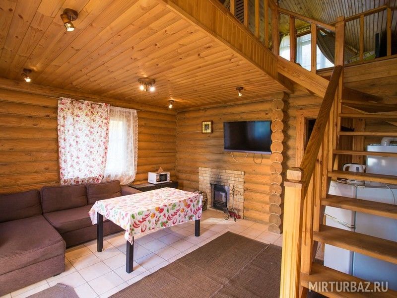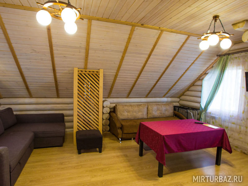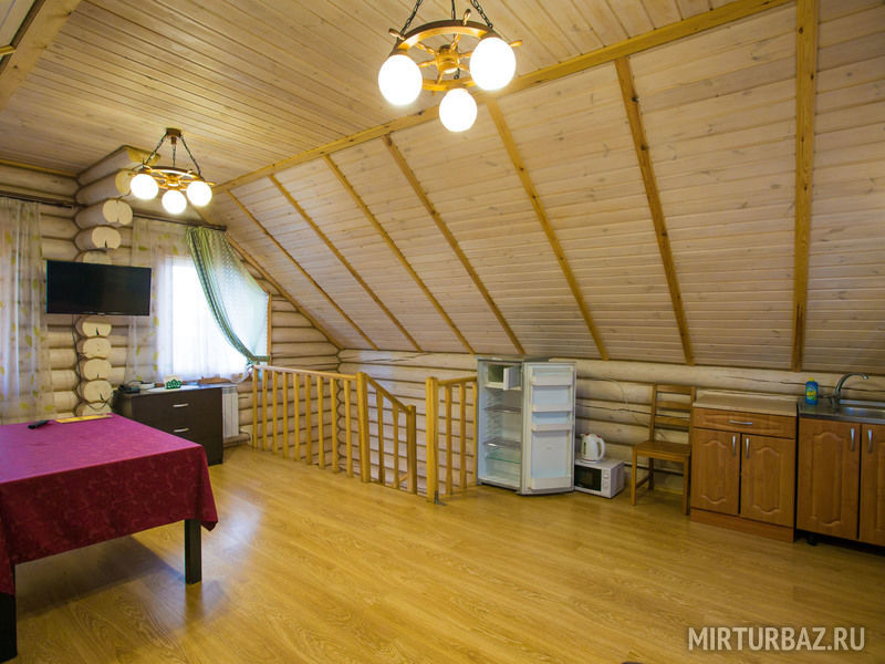 В доме имеется баня, холодильник, СВЧ-печь, посуда. На втором этаже большая мансардная комната с мягкими диванами и столом, за которым может расположиться большая дружная компания. На улице есть еще один столик и мангал. Возможна аренда домика по часам, подробности уточняйте у администратора.