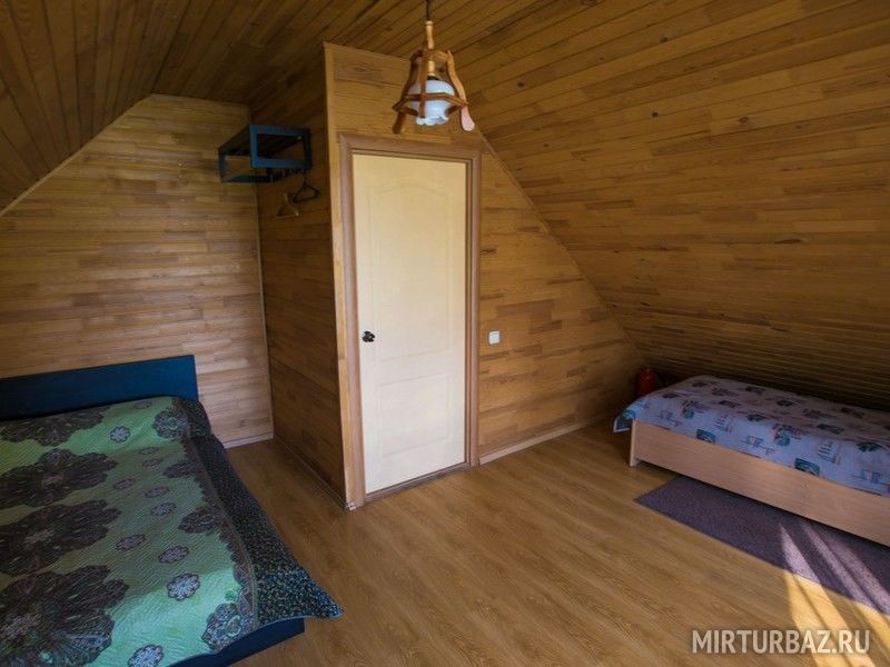 В доме имеется баня, холодильник, СВЧ-печь, посуда. На первом этаже небольшая гостиная, с большим столом и мягкими диванами. На втором этаже просторная комната с дополнителными диванами и большой кроватью. На улице есть мангал. Возле домика располагается детская площадка.