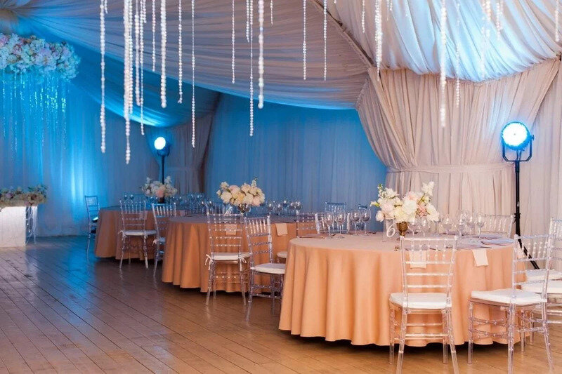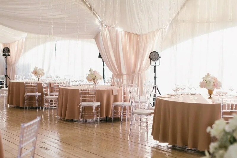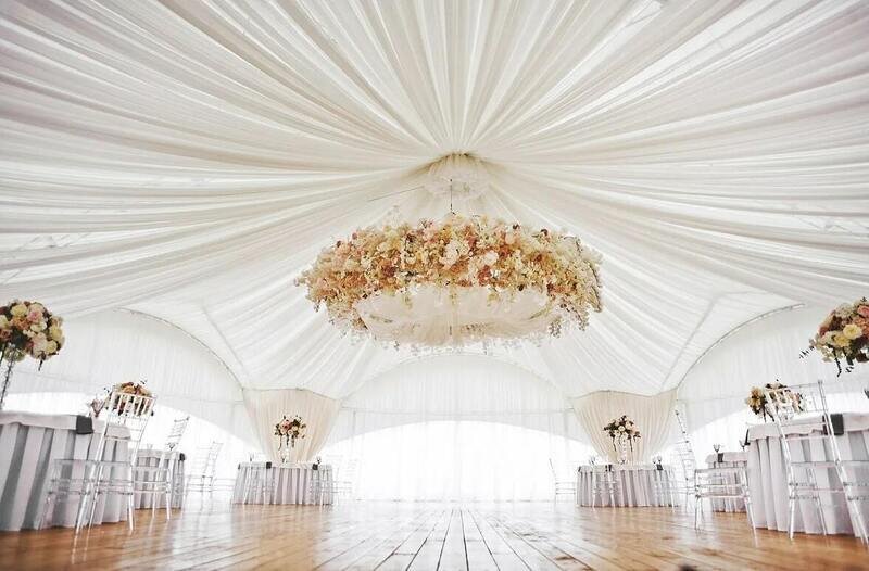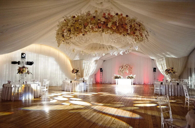 Новый атмосферный шатер создан для летних мероприятий любого формата. Пространство шатра выполнено в светлых тонах, а купол украшает драпировка легкой воздушной тканью. Прилегающая к шатру терраса может играть роль пространства для встречи гостей, а также выступить отличным местом для фотозоны. В шатре «Флагман» вы сможете воплотить любые свои идеи и придать неповторимый индивидуальный стиль своему мероприятию.