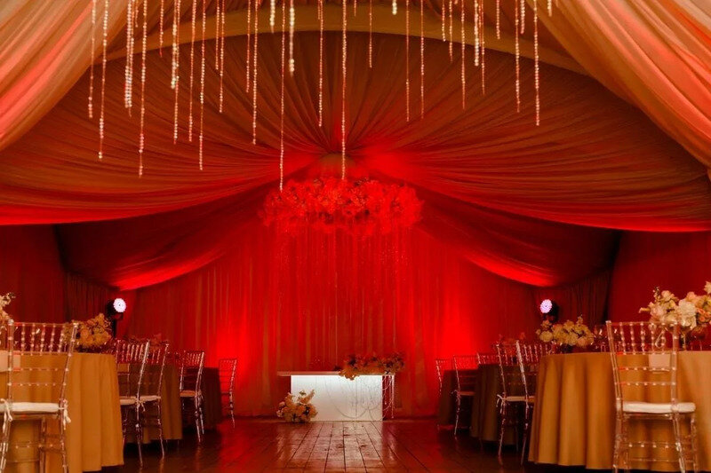 Легкая, практически невесомая драпировка, уютная мягкая мебель и приятное теплое освещение в шатре создает атмосферу комфорта и спокойствия. Приветственный коктейль для гостей или посиделки с друзьями на открытой веранде, что прилегает к шатру — решать вам.