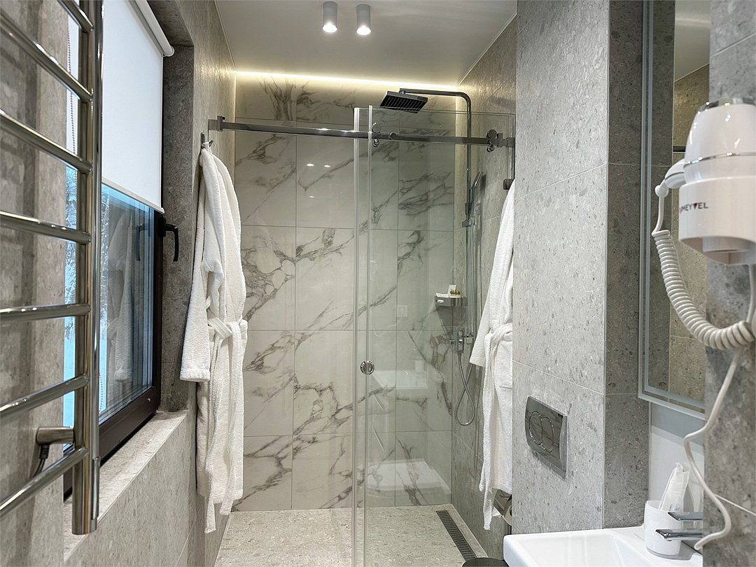 телевизор, кабельное телевидение, Wi-Fi, интернет, телефон, светильник, фен, будильник, электронные замки, душевая кабина, ванна или душевая кабина, санузел, теплый пол, банные принадлежности, халаты, банные полотенца, тапочки, косметические средства, односпальная кровать, вешалки, письменный стол, зеркало, унитаз, раковина, отдельный вход в номер, душ, кулер на этаже, вид на реку, стул, тумба, туалетные средства, туалет, вид на парк, цифровое тв, внутренний телефон, телевизор с плоским экраном, мини-холодильник, телевизор со Smart TV, вид на лесВ номере